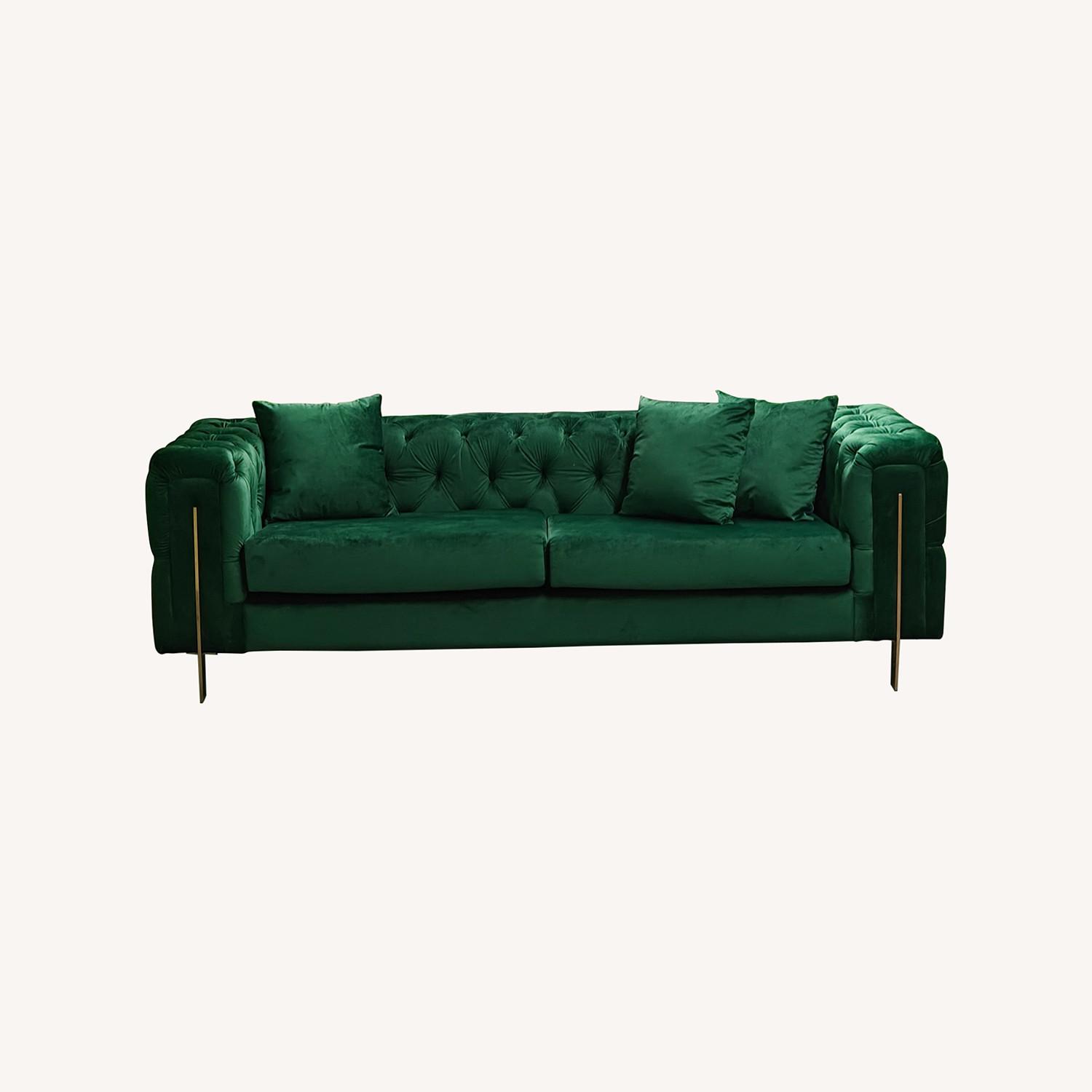 Seller's Notes:The evocation of an uncommon romance. Song Sofa is a modern take on the classic Chesterfield sofa: traditional, elegant rolled arms and fully tufted cushions on the back and sides, all in our lush velvet upholstery. Design detail of brass finished legs that extend up into the arms: a subtle, sleek touch.