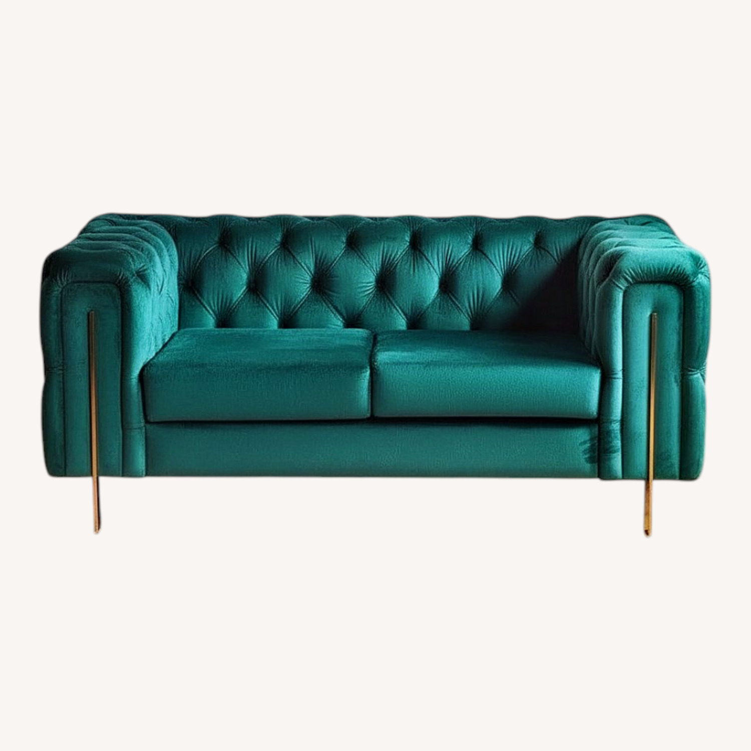 Seller's Notes:The evocation of an uncommon romance. Song Sofa is a modern take on the classic Chesterfield sofa: traditional, elegant rolled arms and fully tufted cushions on the back and sides, all in our lush velvet upholstery. Design detail of brass finished legs that extend up into the arms: a subtle, sleek touch.