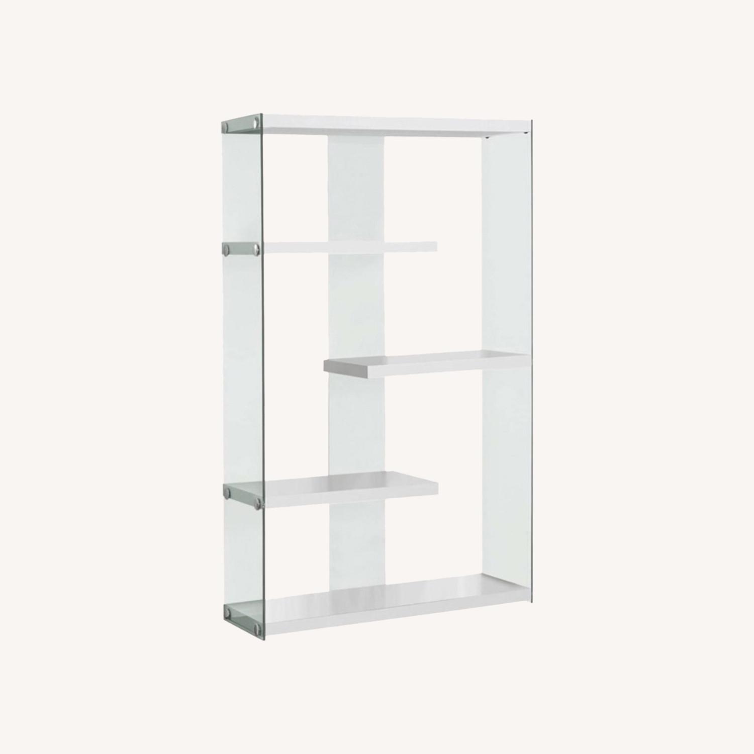 Seller's Notes:Add a modern touch to your home with this elegant white finish bookcase featuring thick panelled construction, tempered glass sides and back, and stylish polished chrome accents. Four fixed open concept zig-zag shelves provide a fashionable way to display your most treasured possessions in your living room, office, den, family room. Bought this a couple years ago. Love the shelves and style! Would keep it, but unfortunately it’s not the ideal size for how we’re rearranging the apt. It’s had careful use and no wear and tear. Love the minimalist style. FEATURES AND BENEFITS • 4 fixed zig-zag shelves with tempered glass sides and back • Use as a bookcase or an accent display case for your decorative objects • Modern chic design in a glossy white finish ***Great option for a room divider! Front and back are finished.*** Tempered Glass Wood Shelves Polished Chrome White Lacquer