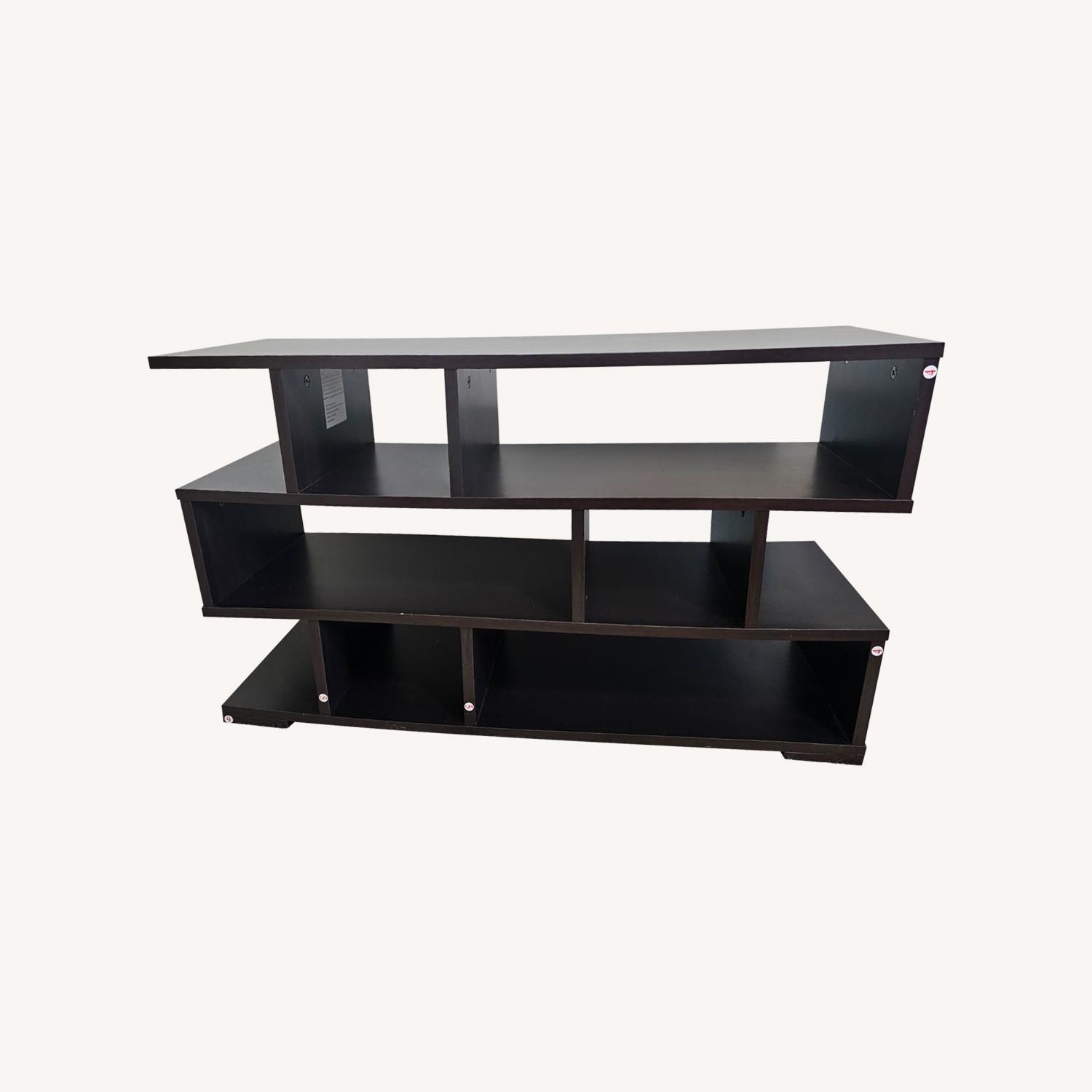 Add a bold, modern touch to your space with this sleek dark brown TV stand. Featuring a striking geometric design and clean, angular lines, it’s both stylish and functional. The rich dark brown finish pairs easily with various décor styles—from minimalist to industrial. Open shelving provides plenty of room for media equipment, game consoles, or decorative accents. Sturdy and eye-catching, this piece makes a perfect centerpiece for any living room or entertainment area. Gently used with minimal wear. Non-smoking home