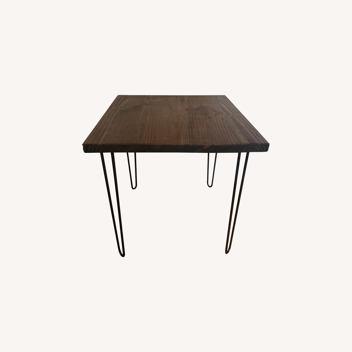 Seller's Notes:I bought this table from a seller on Etsy (no longer active), who made it custom for my apartment at the time. It's great quality wood on beautiful, metal hairpin legs. It's still in great condition. No scratches or anything on the top. There's a small stain of blue paint on the back edge of the table (you can see it in the photo), but that's it. We recently moved and no longer have space for this.