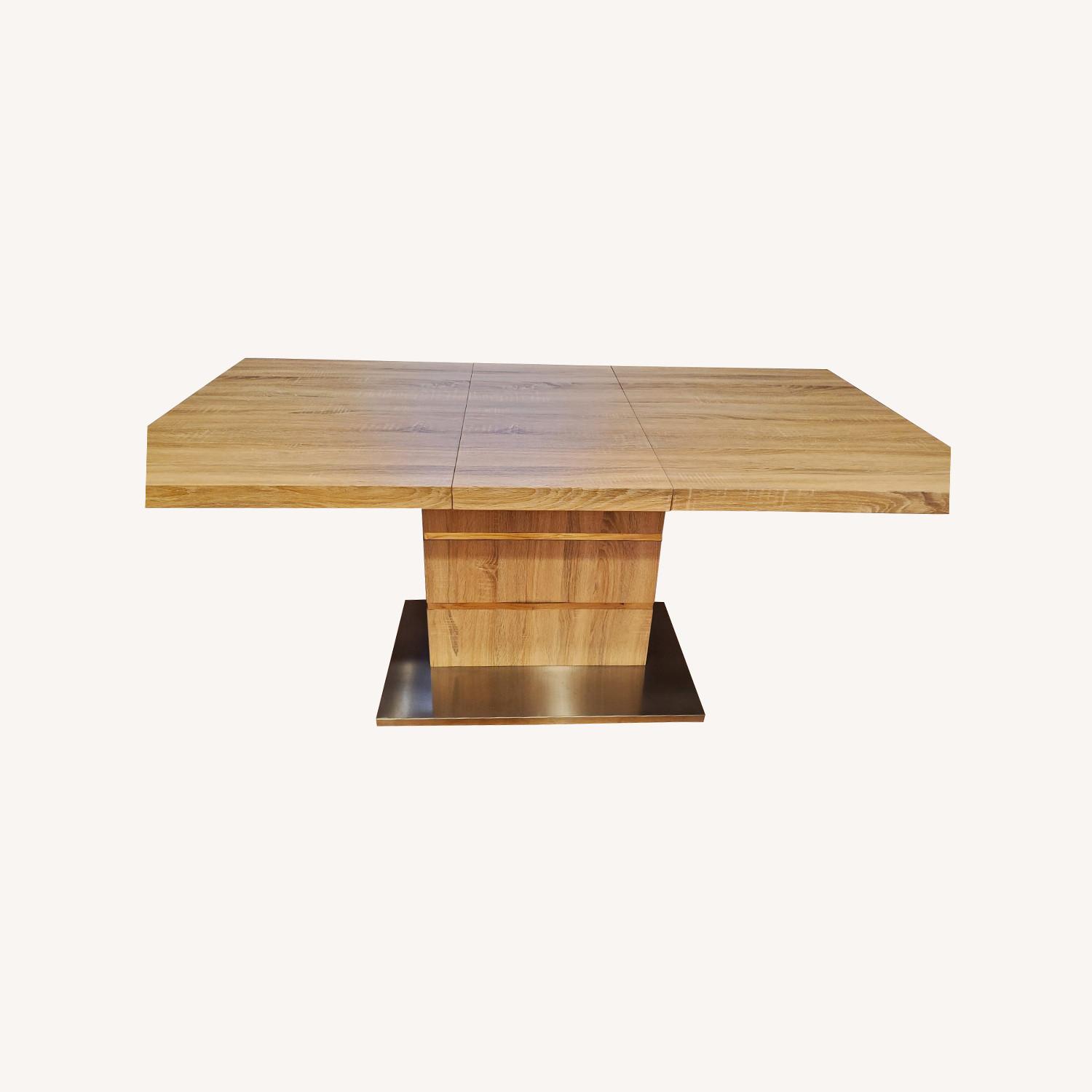 Seller's Notes:Very unique, modern dining table that extends from a 4 seater to a 6 seater comfortably. Beautiful light natural wood tone with an undertone of blush with a nickel metal base and metal accents at the base. Pair with your own seating to make it your own style.