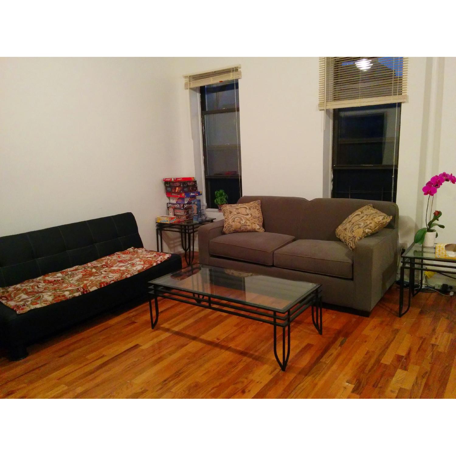 Seller's Notes:Versatile glass and black metal tables. Match with any decor, very sturdy. Coffee table 48"w, 24"d, 12" h, End tables 22"h, 22"d, 21"h.