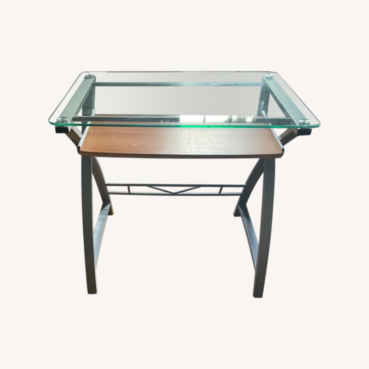 Seller's Notes:This is a perfect minimal computer desk. The wooden lower level slides out for a keyboard, although I used this mainly as a sewing table. It takes up little room and because of the glass top takes up very little visual space.