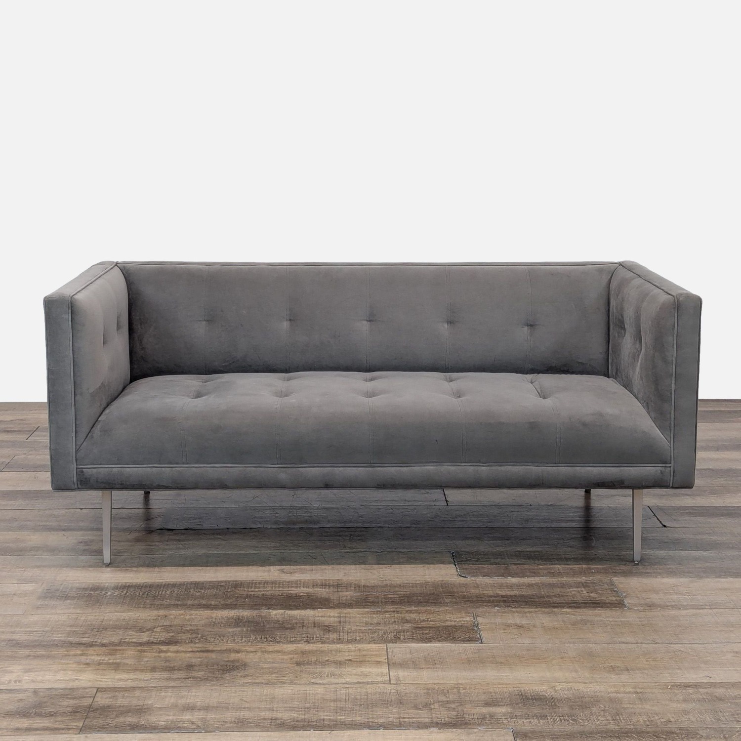 Seller's Notes:Modern sofa with gray suede upholstery with button tufting and sleek metal legs.