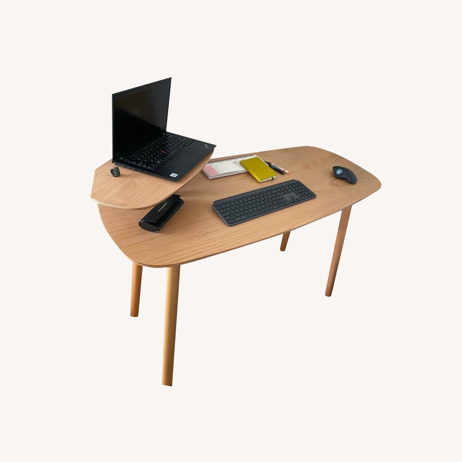Seller's Notes:A non-hideous computer desk, yay! I have loved this desk, but work is getting me a standing desk so... The monitor platform swivels smoothly and is stable. Desk is wide enough to fit two screens plus your laptop, if that's your jam. Surface is super smooth - only sign of use are these light marks on the front part of the desk. I don't know if it's from rubber padding on my keyboard or printer ink or what.
