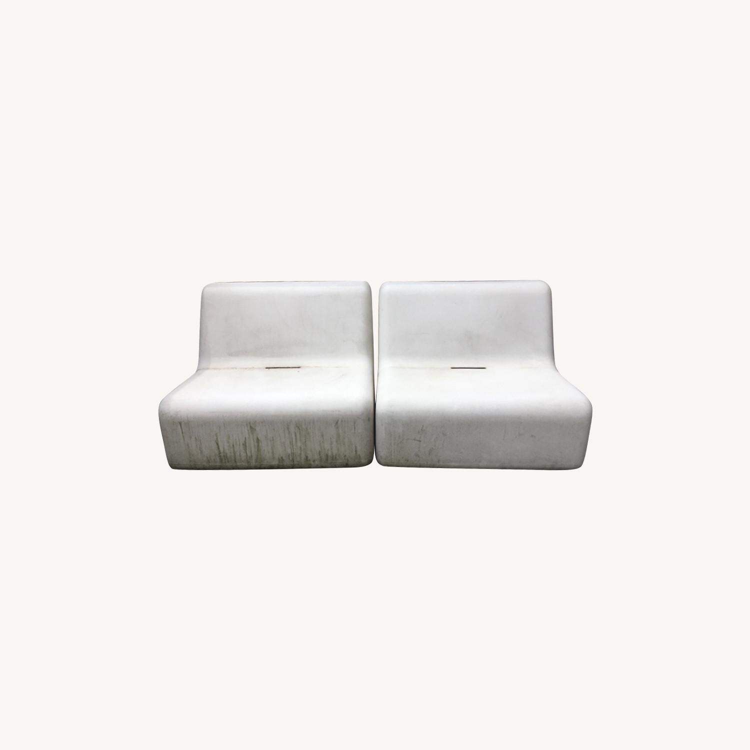 Seller's Notes:Diabla Outdoor seating set including six 365 chairs and 2 tables. This is a convertible and versatile outdoor seating set made of recycled plastic in a modern, aerodynamic style. The set is a few years old and in need of a good cleaning but otherwise in good condition. The material is durable and the pieces are relatively lightweight so they can be moved around and rearranged.