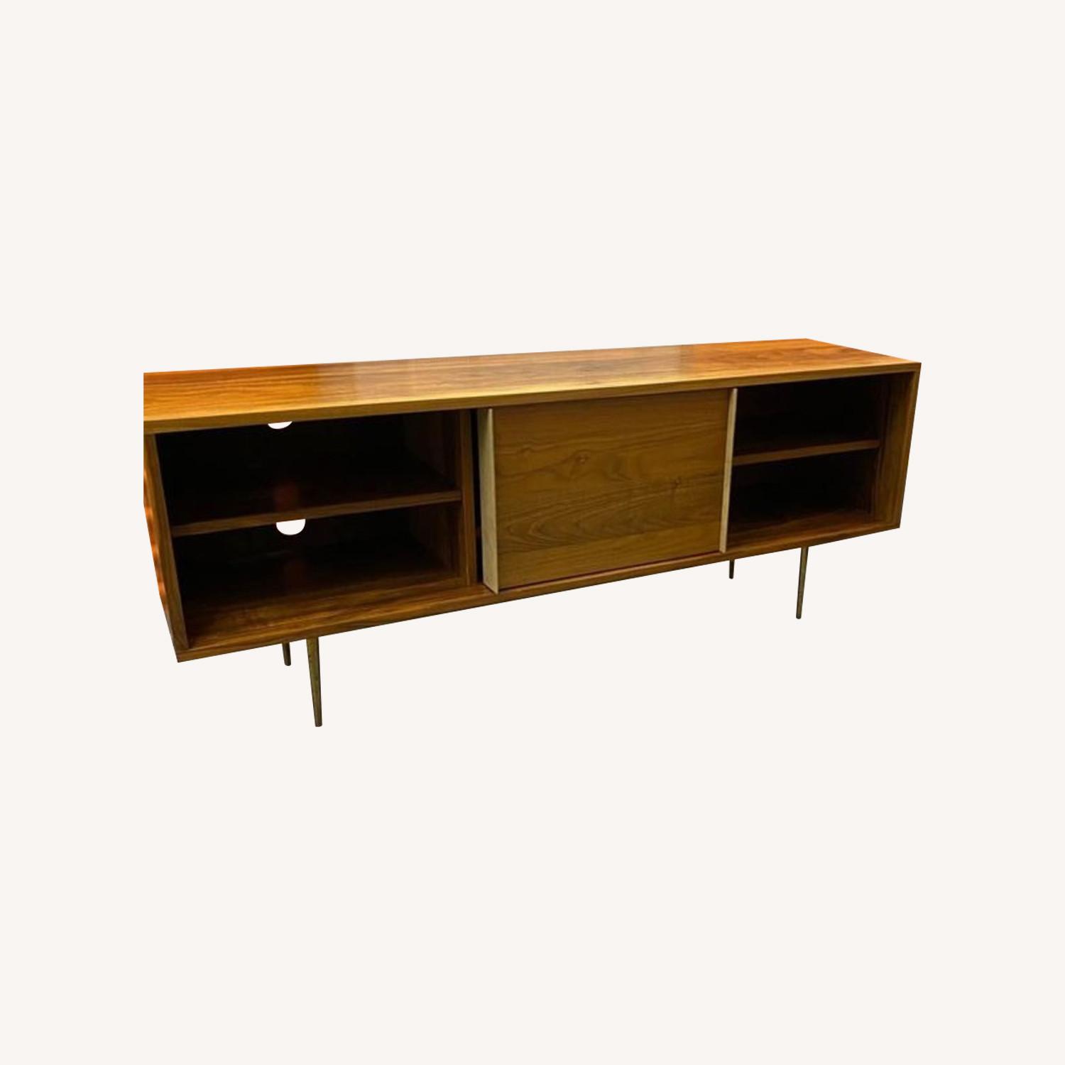 Seller's Notes:Selling this solid walnut tv console. It was a custom piece from STOR New York. Measurements: 60” long 16” deep 23” high (Body is 15”h and legs are 8”h) Details: Three separate sections, two sliding doors on two tracks. Three shelves all adjustable/removable. Solid brass legs and brass door handles. Has some scratches which are shown in the photos. Originally paid $2,200 for it.