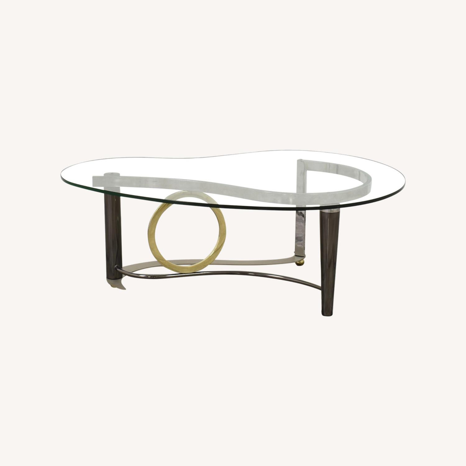 Seller's Notes:Glamorous unique style coffee table in excellent condition, with no visible signs of wear and scratch. This beautiful piece has curved structural black and silvery metal legs with a curve glass top and gold decoration. We originally purchased this vintage piece online with a listed price of $2200. Item is located in a smoke-free, pet-free, child-free living room. Definitely a rare find and beautiful in any setting!