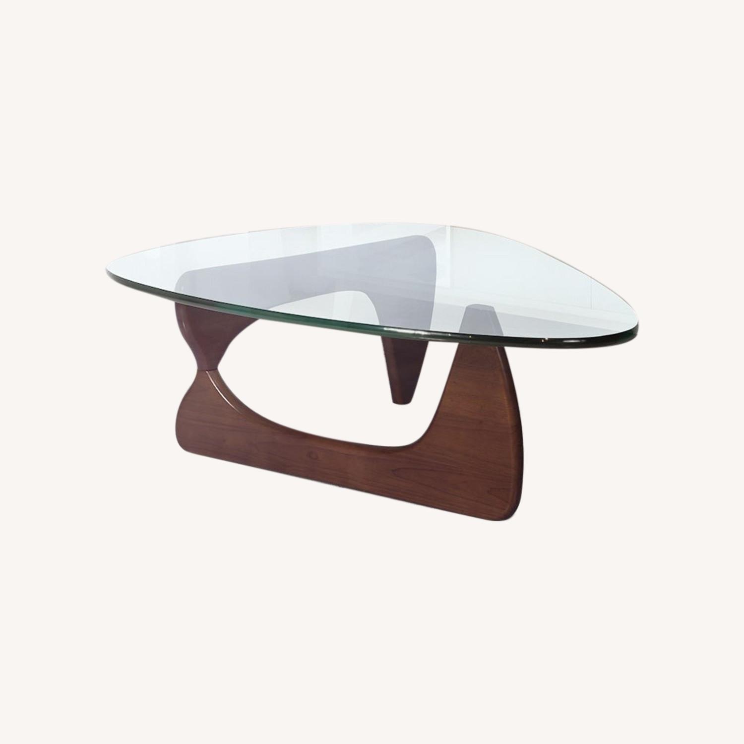 Seller's Notes:Based on Noguchi's original design. The brilliantly simple design consists of only three elements, the glass top and two interlocking wood base pieces. The table is an extraordinary harmony of form and function.