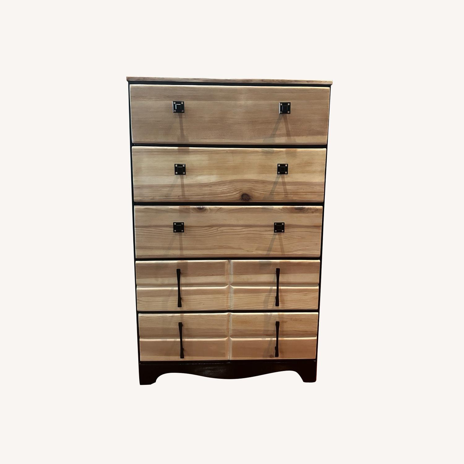 Seller's Notes:This handcrafted dresser is a striking fusion of modern design and organic warmth, perfect for a city space that needs both style and storage. The frame is finished in a smooth matte black, while the drawer faces and top are left in a natural wood tone with subtle grain variation for a clean, Scandinavian-inspired contrast. Each drawer is fitted with sleek matte black handles for a cohesive, minimalist look. With six spacious drawers and a tall profile, it’s ideal for maximizing vertical storage in apartments, lofts, or compact bedrooms. Whether you’re styling a modern industrial space, a Japandi interior, or an eclectic urban sanctuary—this piece grounds your room with quiet confidence. Details: • Hand-refinished and sealed for durability • Satin black frame with soft wood grain drawers • One-of-a-kind piece – not mass produced • Dimensions: 43 1/2 x 26 1/4 x 15 Condition: Excellent – refinished with care and ready for immediate use.