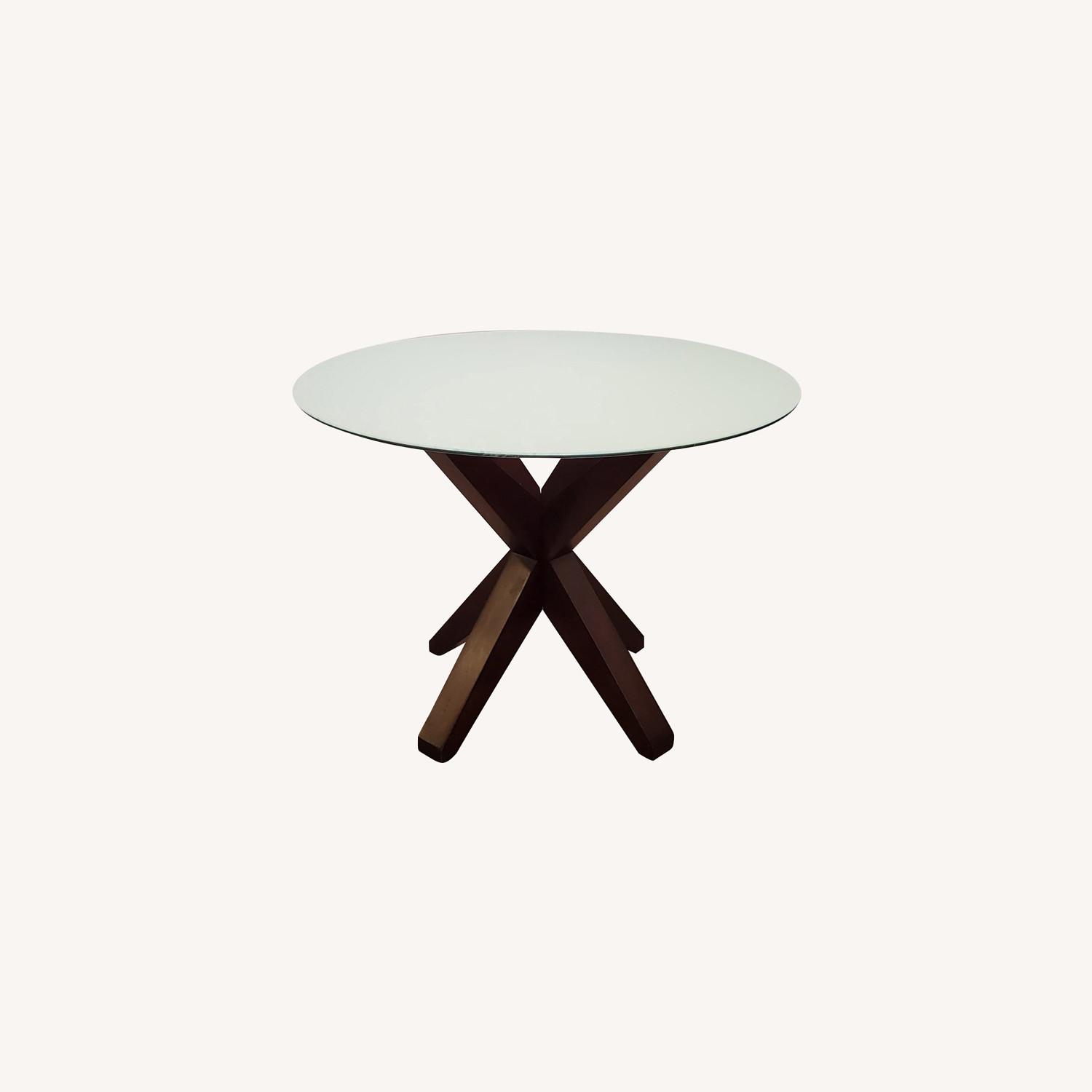 Seller's Notes:Modern Wood and Glass Round Pedestal Dining Table. Great Condition. Solid construction, handmade and timeless design. 30" H 42" D Seats 4 - 6 comfortably. Dark brown/mahogany finish. Glass top is thick 3/8". The glass is clear, I have industrial contact paper on the bottom which adds a nice milk-glass effect. It can be easily peeled off if desired. Table and glass only. Does not include chairs.