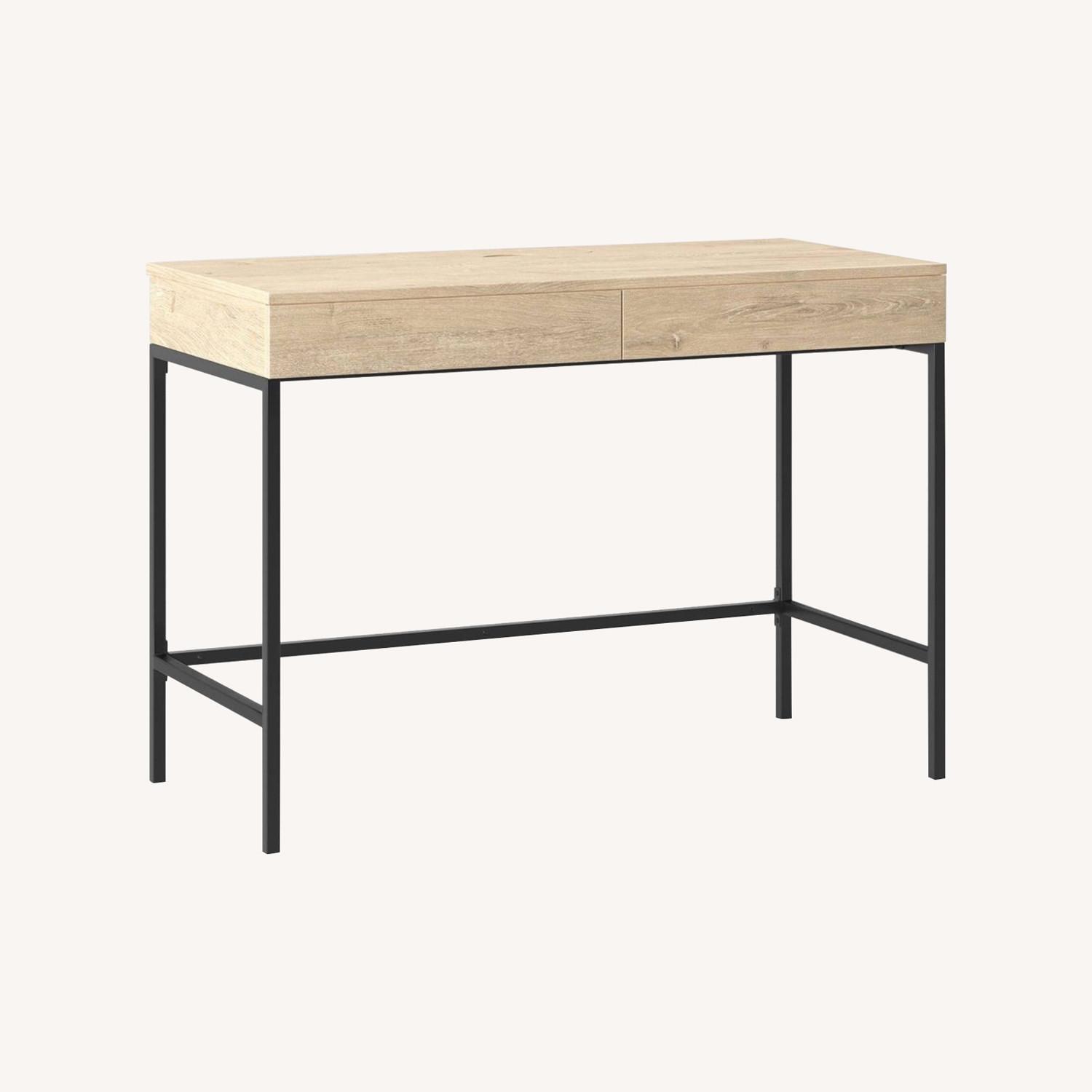 Seller's Notes:Mid-century modern Project 62 oak desk with drawers and charging station • Writing desk that can double as a console table • 2 side-by-side drawers provide storage to keep your space clutter-free • 4-point base and metal frame for sleek and sturdy construction • 2 outlets and 2 USB ports housed in a cubby along the back to charge phone or computer while keeping wires hidden