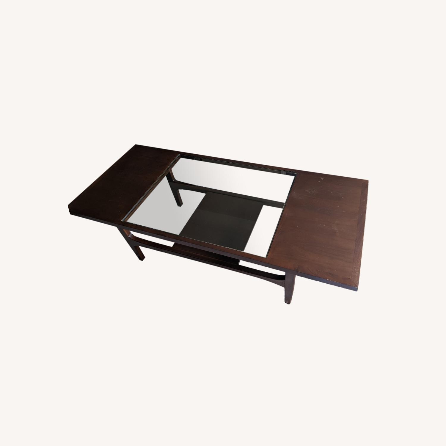 Seller's Notes:Mid-Century Modern Wood & Glass Coffee table purchased from Jennifer Furniture in 2016. This item has minor scratches and one small stain (see photo) after many years of use and love. We are opting to sell this lovely table because we now have a three month old who will soon be needing a bigger play space in our small apartment.