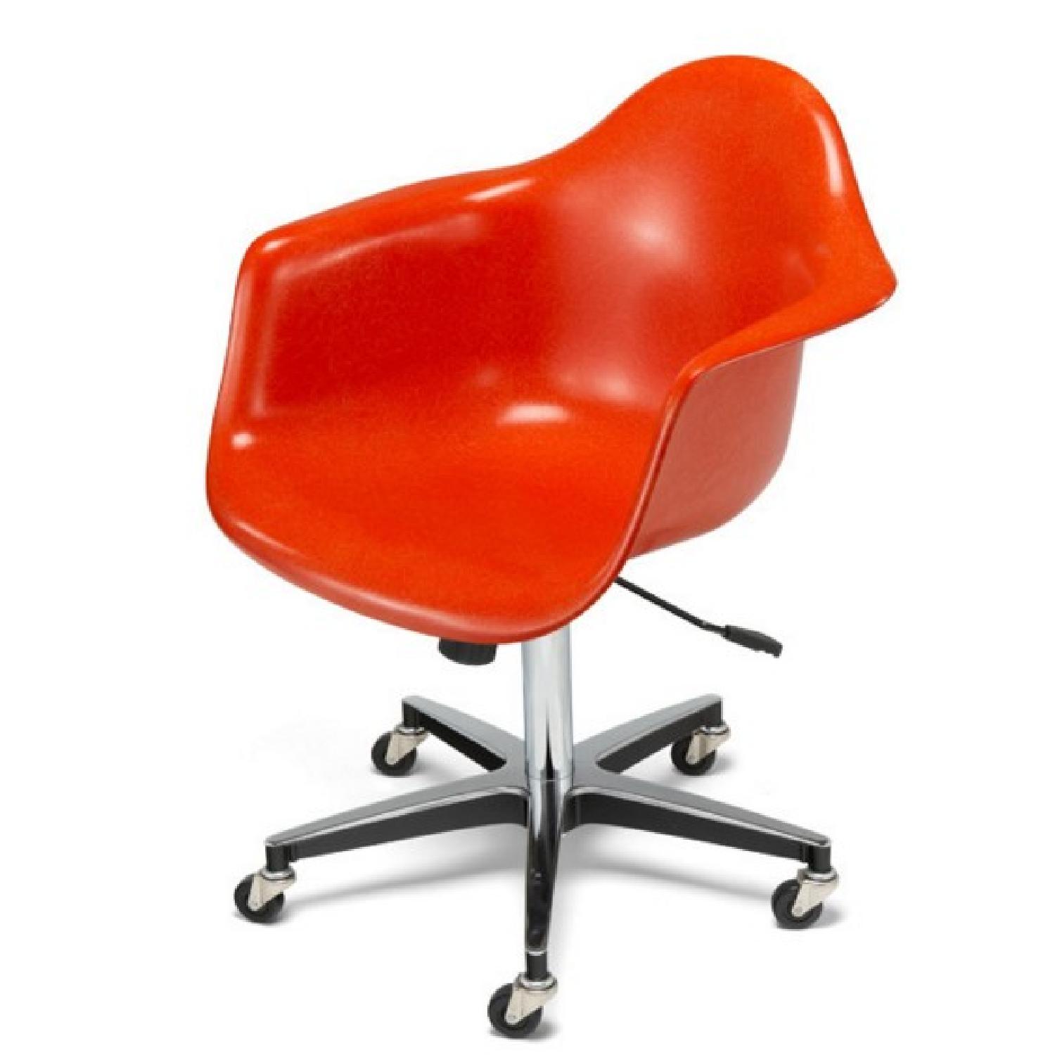 Seller's Notes:I listed these as office chairs but I have been using them as dining chairs to bring a splash of color and modern touch to traditional table. The color looks like it has tons of tiny white lines in it, but they are not really scratches -- the surface is smooth. The edges are somewhat discolored and there may be a stain here and there, the chairs have been heavily used, but functionally still work very well. The height is adjustable by 5 inches, from 31 inches from top to bottom to 36 inches.