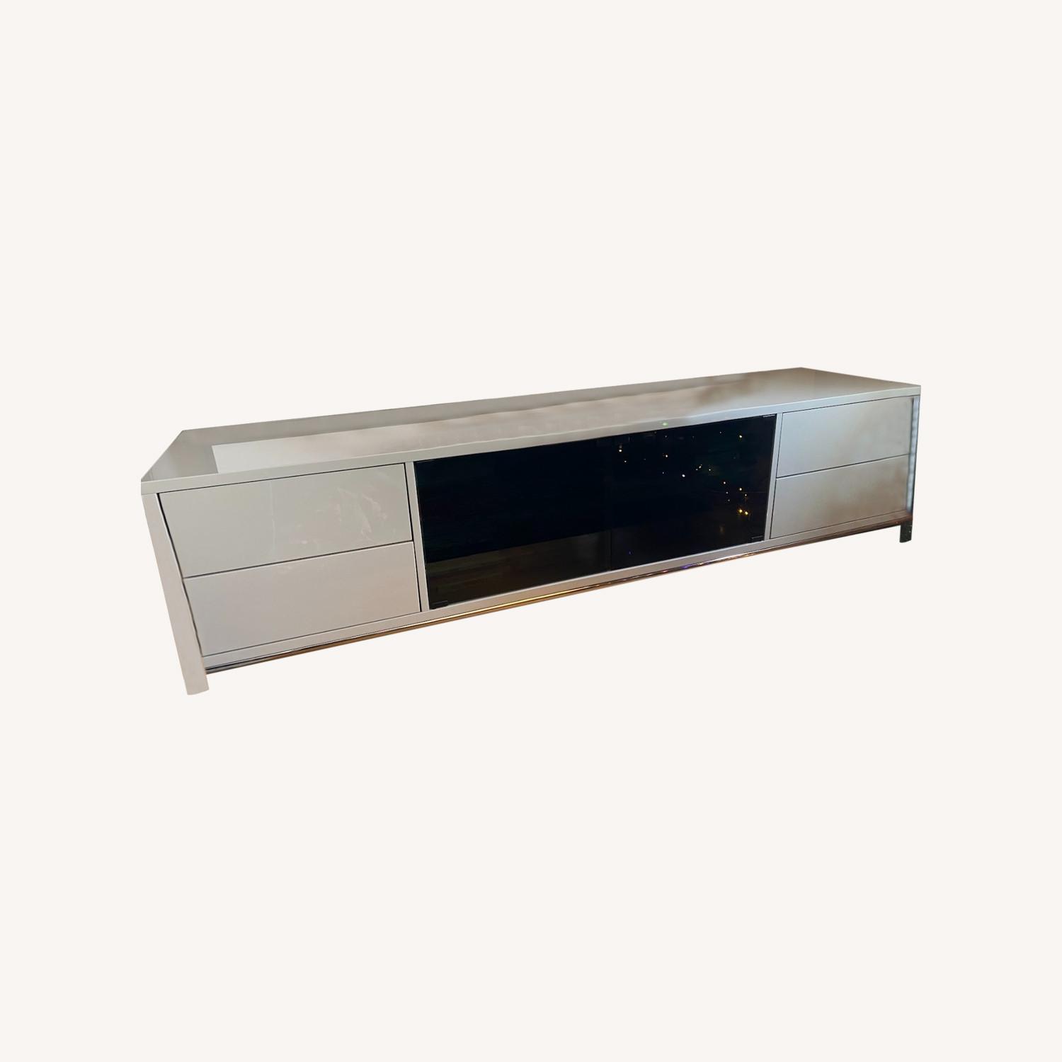 Seller's Notes:This sleek Modloft media cabinet is in Glossy Chateau Gray. It is only one year old and in beautiful condition. Includes push-open drawers and rear ventilation holes for wire management. A fantastic feature piece and adds great storage to your living space.