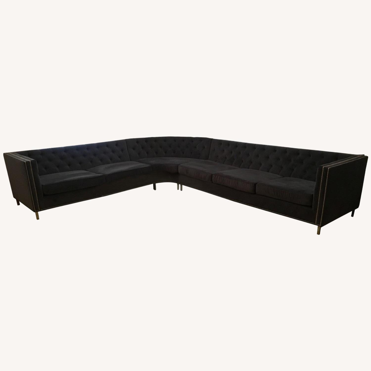Seller's Notes:Curved sectional sofa with tight tufted back and loose seat cushions with foam and down fill. Polished nailheads and chrome legs. Upholstered in Brown Velvet. Separates into three parts. Materials-Velvet & Chrome Dimensions Width 122" Depth 145" Height 30" Seat Height 16" Sofa: Depth 36" Left sofa: Width 73.5" Right sofa. Width 97" Corner: Width 67" Originally purchased for 4500 Bought from Modshop and in good condition. Recently had it professionally cleaned. Some water stains but hardly noticeable..overall good condition! You have to pick it up and handle ALL transporting of couch. It has to be taken apart in order to leave my apartment..I have done It before it splits into 3 different parts. PILLOWS INCLUDED! ( NOT BLANKETS) Smoke Free Home No Pets
