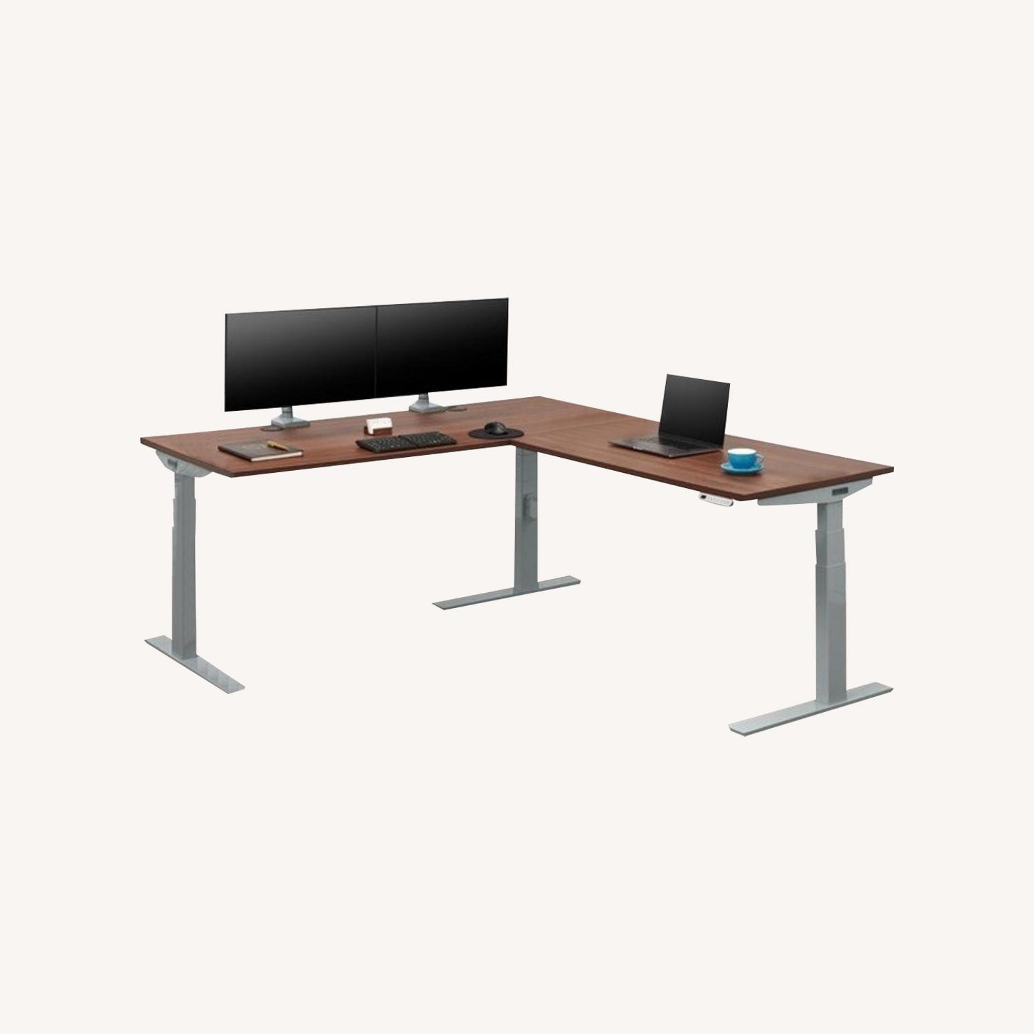 Seller's Notes:Brand new condition Modular UPLIFT standing desks. Two separate desks that can be used as one L shaped desk. Specifications: Walnut Laminate color Desktop Size 80x78x30x27 80"Mx78"R Return Side L Return on Left Side Frame Color Black FREE Additional items included: Bundle Two Grommet Covers - Black Bundle Basic Keypad Promo Writing Desk Pad - Black Desk Organizer Set - Eucalyptus Notebook Tablet Stand - Black Wire management tray - Black Cable tie mounts - Black Frame anchor plates - Black FREE SHIPPING!