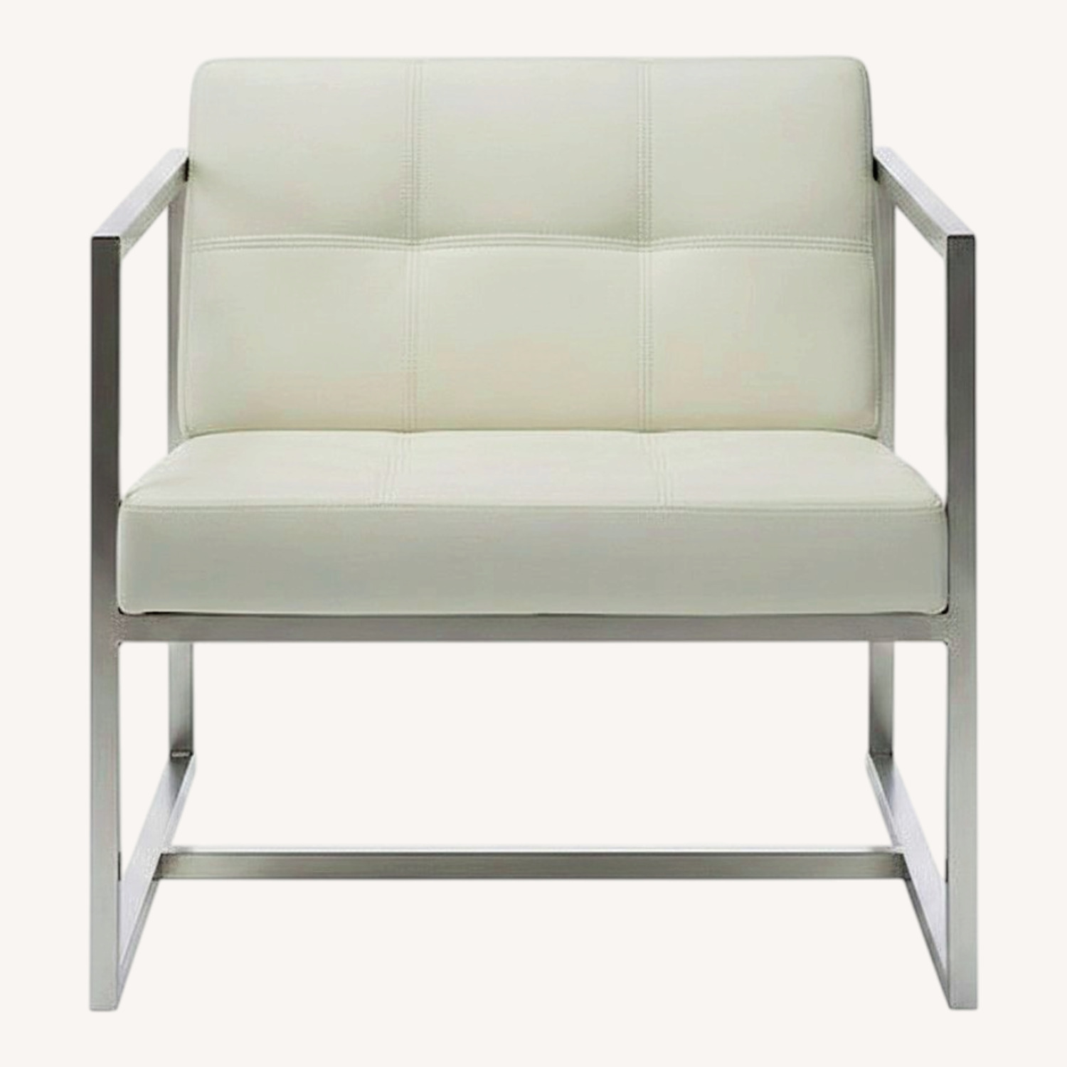COMFORTABLE SEATING - Sitting atop a polished stainless steel frame, the geometric design and broad, spacious seat of this accent chair offer ergonomic support with a deep pocket and gentle recline