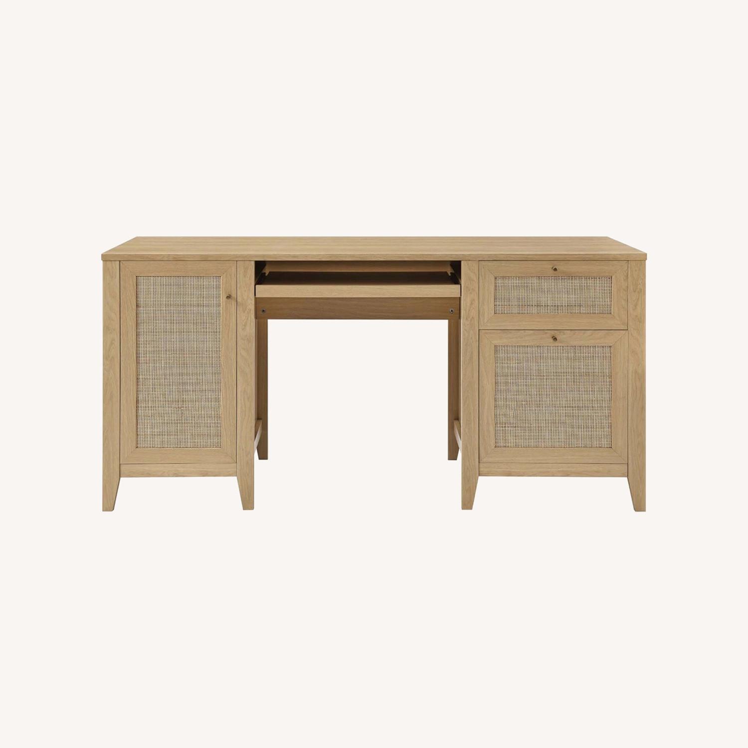Introduce refreshing style to your workplace with the Soma 63" Office Desk. Showcasing a beautiful rattan weave on the fronts of the storage areas, this computer desk brings aesthetics and modern functionality to the office, lounge area, apartment, college dorm room, or another workspace. This writing desk is crafted from durable MDF and particleboard with a natural wood grain finish. This home office desk is complete with a slide-out keyboard tray and concealed storage areas behind a cabinet door and in two spacious drawers to keep visual space clean and office essentials neat and organized. Includes non-marking foot pads to protect flooring. Assembly required.