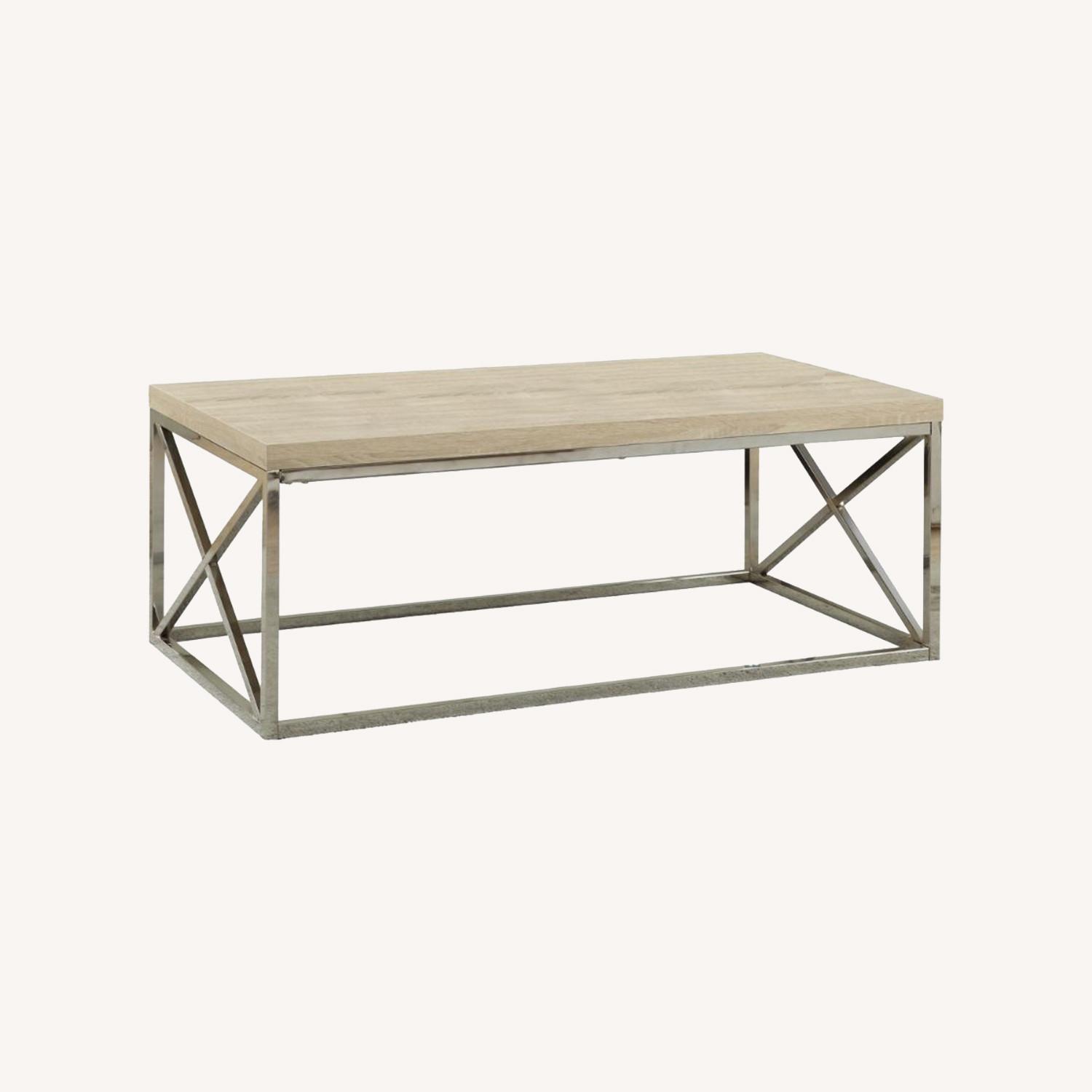 Seller's Notes:-slight wear on one of the corners but otherwise in amazing condition -Color/finish: natural -Design details: Made from particle board, laminate, metal; Ample surface space in a trendy natural reclaimed wood-look finish; Sturdy, stylish chrome criss-cross base; Thick panel rectangular top that is easy to clean; Contemporary design coffee table for a living room, den, office space, family room; Blends well with any decor -Measures 44in wide x 22in deep x 17in high - Retails for $217