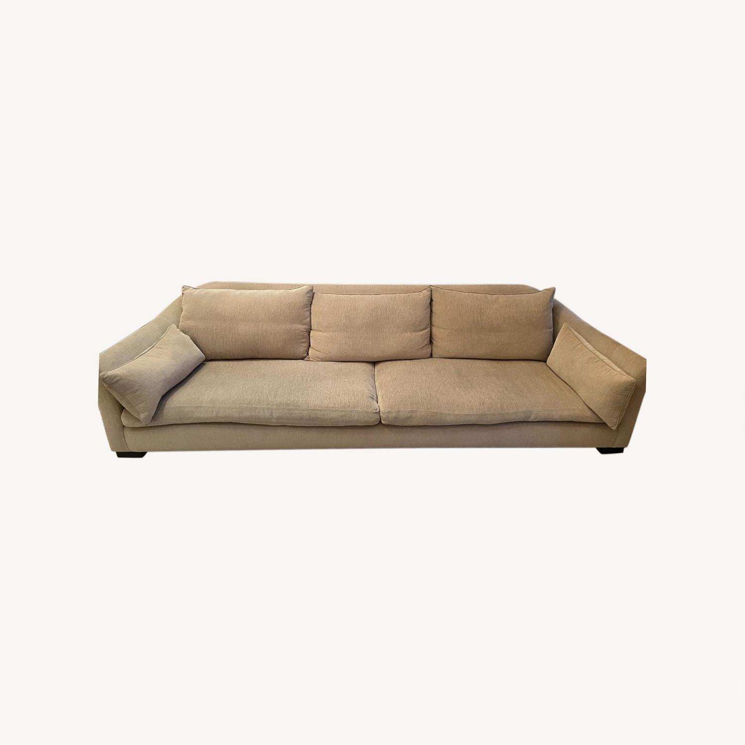 Seller's Notes:This is a custom Montauk Sofa Julian Couch that is 10 feet long so please make sure this item can fit in your elevators and doorways before purchasing. For the first 8 years, it was barely used as it was in a room without a television so it doesn't have that much wear and tear for its age. There is a stain on the side of the couch close to the back that happened during a move and it's not really noticeable by guests as it's lower to the ground. The fabric is textured and it was the Abridge fabric in Sand. The seat is 5.5 inch foam with a down wrap. It's the perfect couch for a family of 4 to watch a movie and still have your individual space. Will add in 4 pillows.