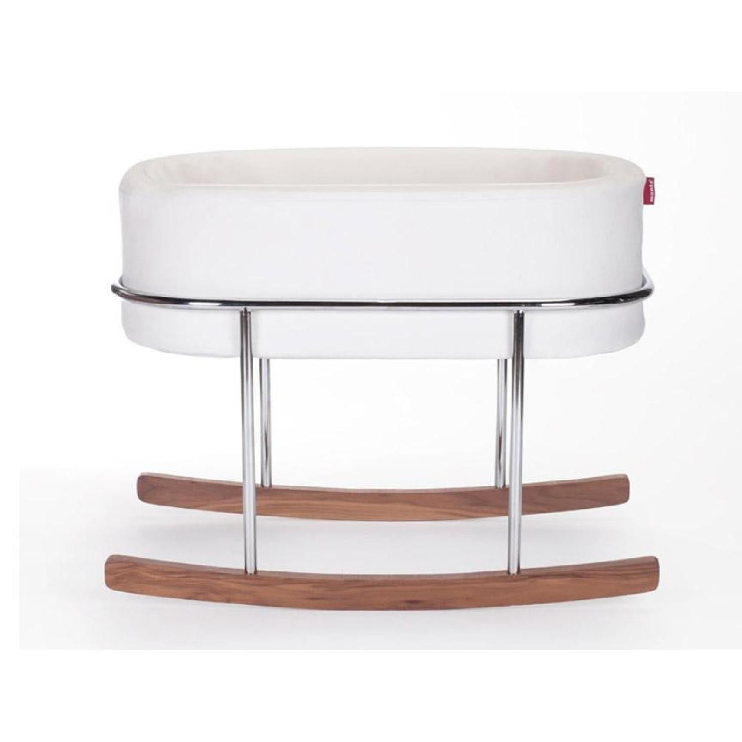 Seller's Notes:Excellent Condition. Less than 10 months old and looks new! Rockwell bassinet is the perfect combination of beautiful materials and a soothing rock for your little one. Its streamlined chrome stand with solid walnut rocking feet is beautifully contrasted to the soft upholstered basket that can be removed and transported to different rooms in your home. Basket and stand are handcrafted and sustainably made in Canada using the highest quality materials Basket includes soft and protective sides that are covered by a removable and machine-washable fabric * Basket is white micro suede or heather grey fabric * Polished chrome legs with solid walnut rocker base * Includes 4 white fitted 100% cotton sheets * Newborn can use until baby is 18 pounds or can roll over & move around * Foam is free of any flame retardant chemicals.