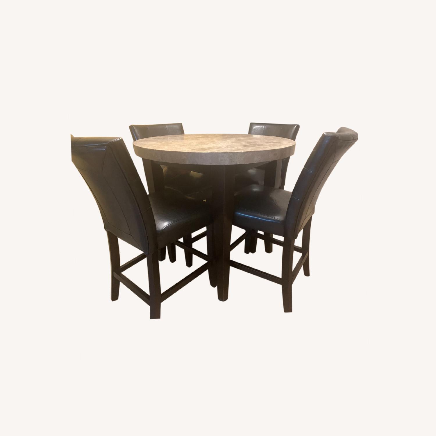 Seller's Notes:This beautiful dining set was purchased from Bob's Discount Furniture and would be perfect in a small apartment or smaller dining room. Its elegant look would fit very well with a modern style. My family has enjoyed many dinners at this table, and it still has held it's own throughout the years. Aside from some slight tearing on one of the chairs and a small (but hardly visible) crack on one side of the tabletop, the set as a whole is in very good condition. I have high hopes that this dining set will continue to bring more wonderful memories of family dinners and game nights in its next home!