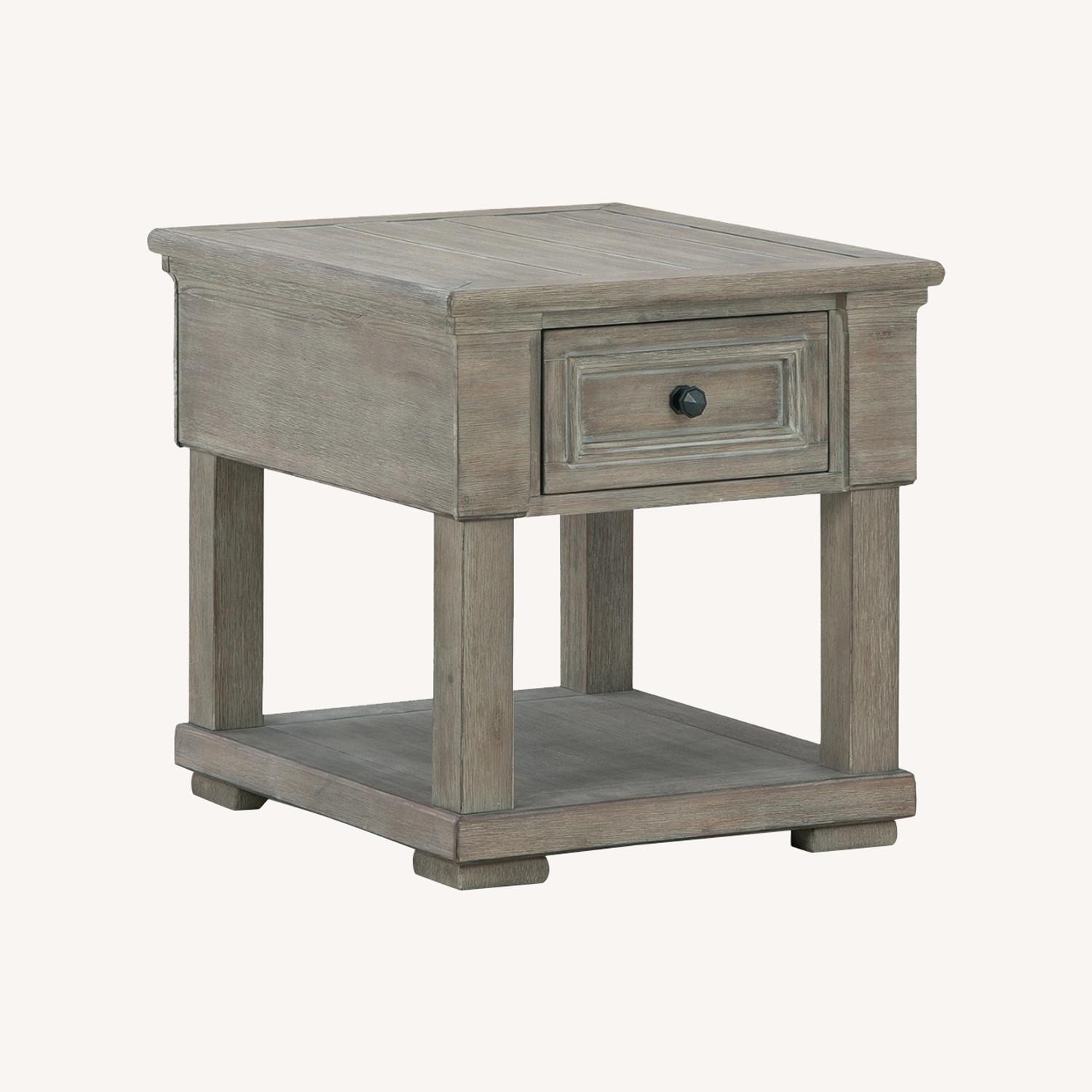 Seller's Notes:Lighten the look of your living space. The Moreshire end table offers a casual traditional aesthetic, with natural wood undertones enhanced by a glazed bisque finish and wire-brushed texture. Its drawer and lower shelf add convenient storage and display space.