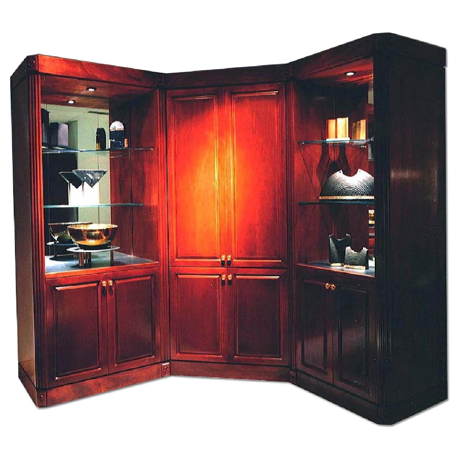 Seller's Notes:Honduran Mahogany corner wall unit featuring a motorized rotating center section. This unique cabinet freatures a center rotates to become the TV, a door or a display cabinet with glass shelves, a mirrored back with lighting. The transitional design features fluted columns with medalians and raised panel doors. A contemporary crown and base molding allow this unit to complement both a traditional or comtemporary room desingn The left lower cabinet is for bar storage wth a wine rack. The right side had 3 storage drawers. Storage shelves are beneath the rotating center. cabinet. The rotating center cabinet will accommodate a TV up to 37". Construction is a mix of fine hardwoods & select wood veneer. Corner unit Dimensions - Left side 84" W / Right side 80" W x 84" H x 24" D This item was custom made and only used as a display item so has had very little use and is in good condition.