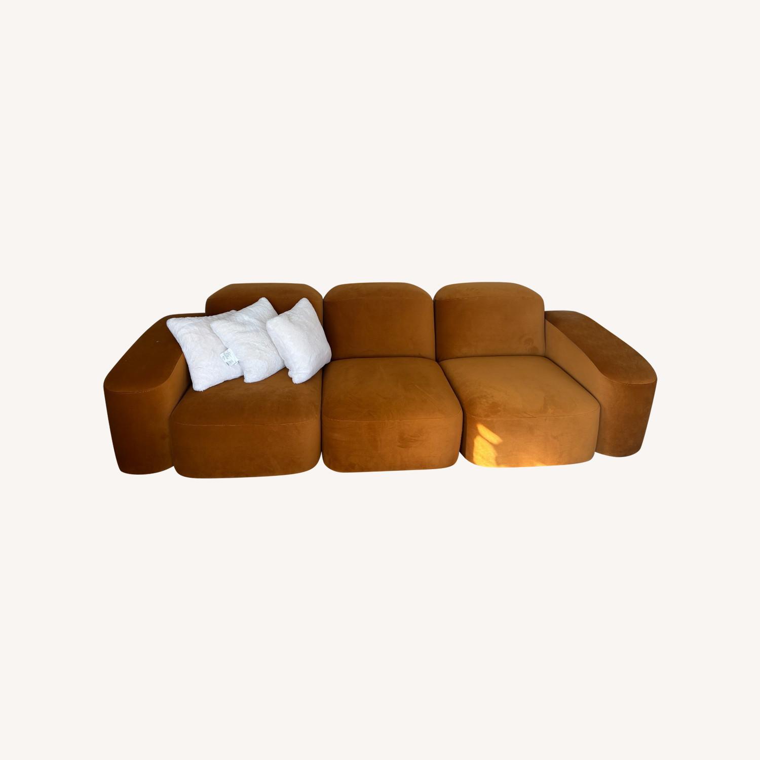 Seller's Notes:This is Sarah Ellison's three-seater Muse Sofa. It's a gorgeous caramel color that warms up the space. We love this sofa for its low profile and fun silhouette. This sofa is modular and you can add a corner piece or an ottoman to it. Unfortunately, we're selling it to get a sofa that better fits our small living room. We will have this sofa thoroughly cleaned before pick up or delivery.