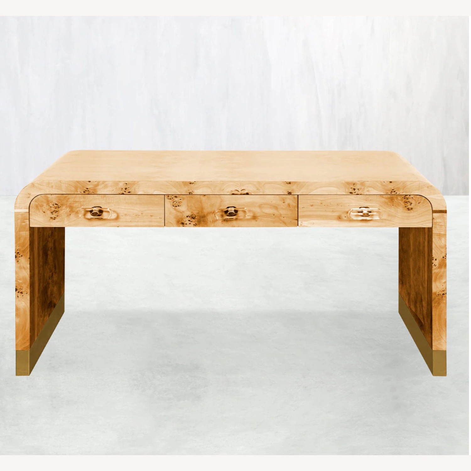 Make a bold statement in your office with the Mykonos Desk! This fresh design features rounded desktop edges, brushed brass trim, and three large drawers- perfect for keeping items at hand but out of the way. Spread out and enjoy work with this energizing and focusing space. Shown in a Burlwood with brushed brass leg caps.
