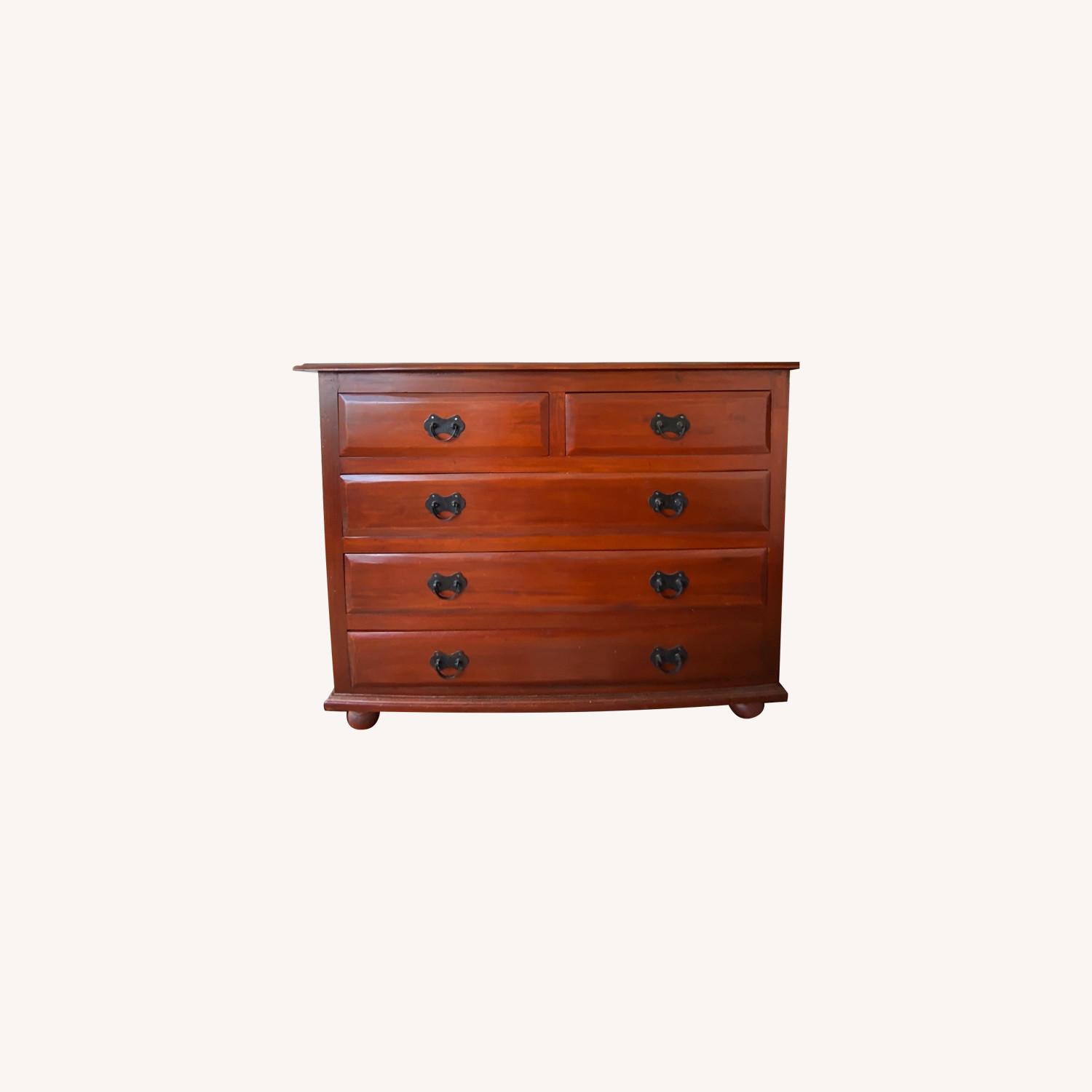 Seller's Notes:About a year ago, I moved to NYC from Chicago and brought all my large furniture pieces -- the dresser being one of them. I absolutely love the dresser and it was one of my first investment pieces I purchased for myself about 6 years ago. I am currently looking to downsize and would love this dresser to go to a home that will love it as much as I do. Info about the dresser: 5 drawer dresser handmade of out of solid wood. Semi heavy / sturdy item and in good condition with minor scratches. Dimensions of entire dresser: 47inW x 38H, Dimensions of small drawer: 20inWx15inD, Dimensions of large drawer: 41 3/8inW x 15inD.