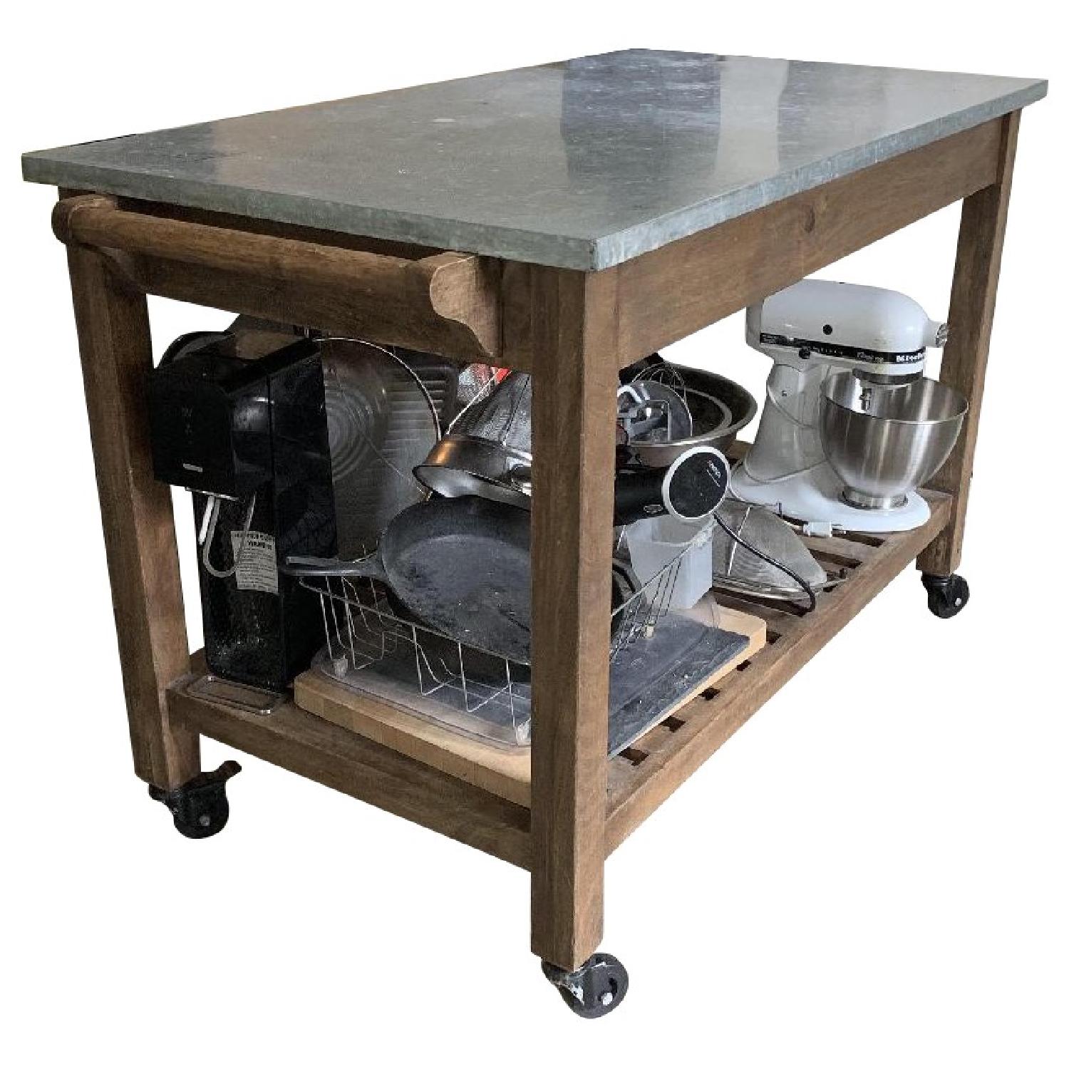 Seller's Notes:Awesome kitchen island! Fits lots of pots/pans, and is the perfect height for cooking. Purchased from Nadeau a few years back. It's served me well for a few years, but I am downsizing apartments and need to part with this lovely island. Some minor marks on the metal countertop - I've included photos for full disclosure.