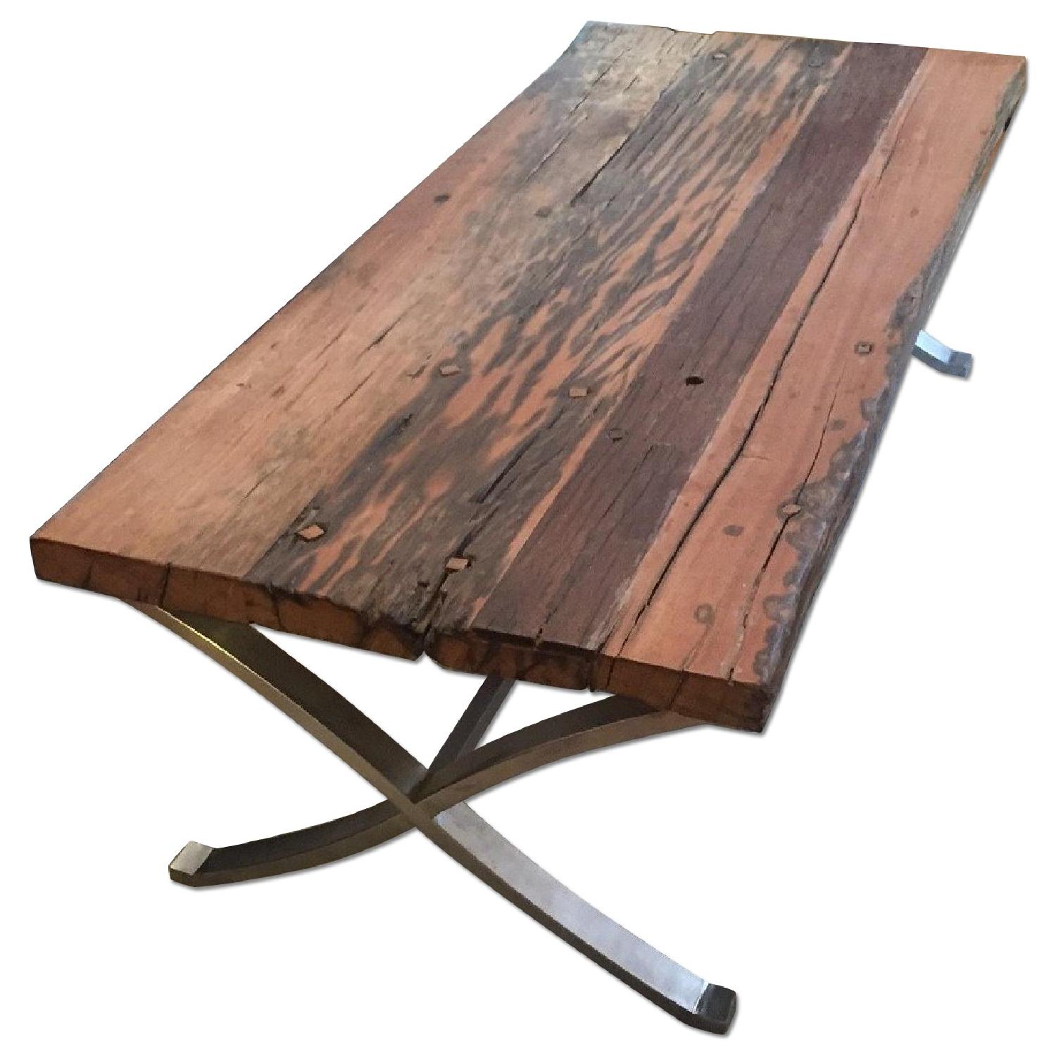 Seller's Notes:I bought this piece for close to $1,000 at Nadeau furniture in the village, which has recently closed. The wood is apparently made up of old train tracks from India. The wood and molded medal base make the table very heavy. There is a distressed natural worn look to the wood, which is part of the look that Nadeau tried to preserve.