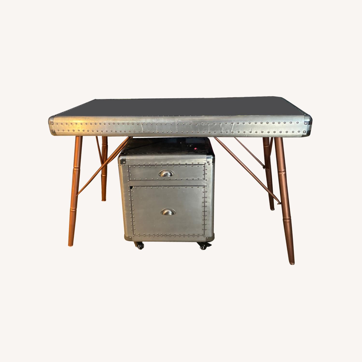 Seller's Notes:Silver desk with rose gold legs and file cabinet for sale. Paid way more for both pieces. Selling as a set. Top drawer of cabinet fits smaller supplies such as pens, notepads etc. Bottom drawer is for hanging file folders or storage if you decide. Must come and pick up.