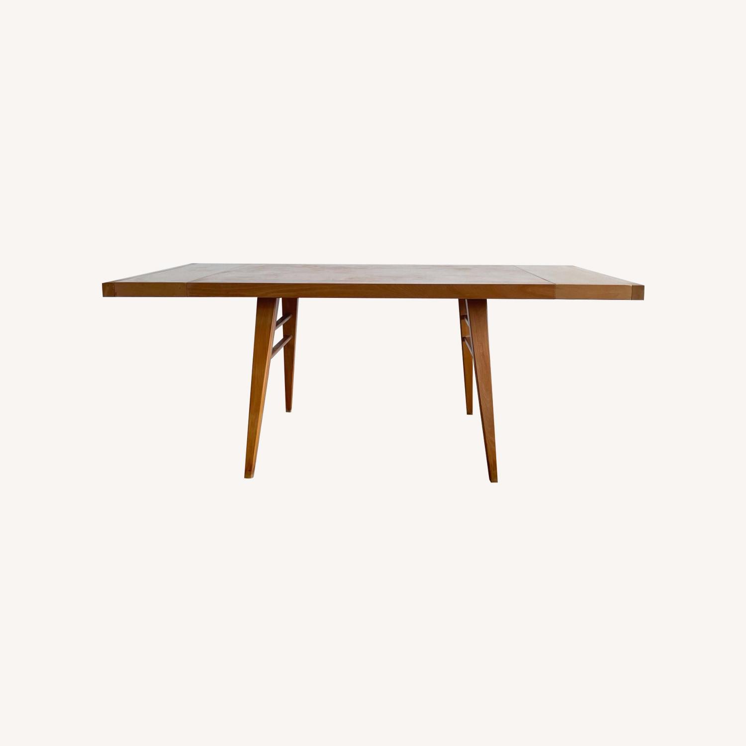 Seller's Notes:This is a piece that will last you forever. Fits in small or big spaces with two extendable leaves. Extend one end or both based on your needs. For apartment living and a bigger home. Seats 4-6 as-is, or 8 when extended. The depth is especially nice; enough for place settings and main courses, not narrow. In the style of George Nakashima’s N20 dining table for Knoll in the late 1940s. Mid-century dining table features a strong solid frame. Looks great from the side too-- see photo. Excellent color tone and a beautiful grain pattern. Soft corners, banded edge inserts that that enclose the table for a timeless mcm look. Easy to use. Simply lift tray off on either sides to reduce width of table. This is in good vintage condition and will have signs of use and wear. 54ʺW × 36ʺD × 29 5/8ʺ T Extended width is 74" W *Chairs not included