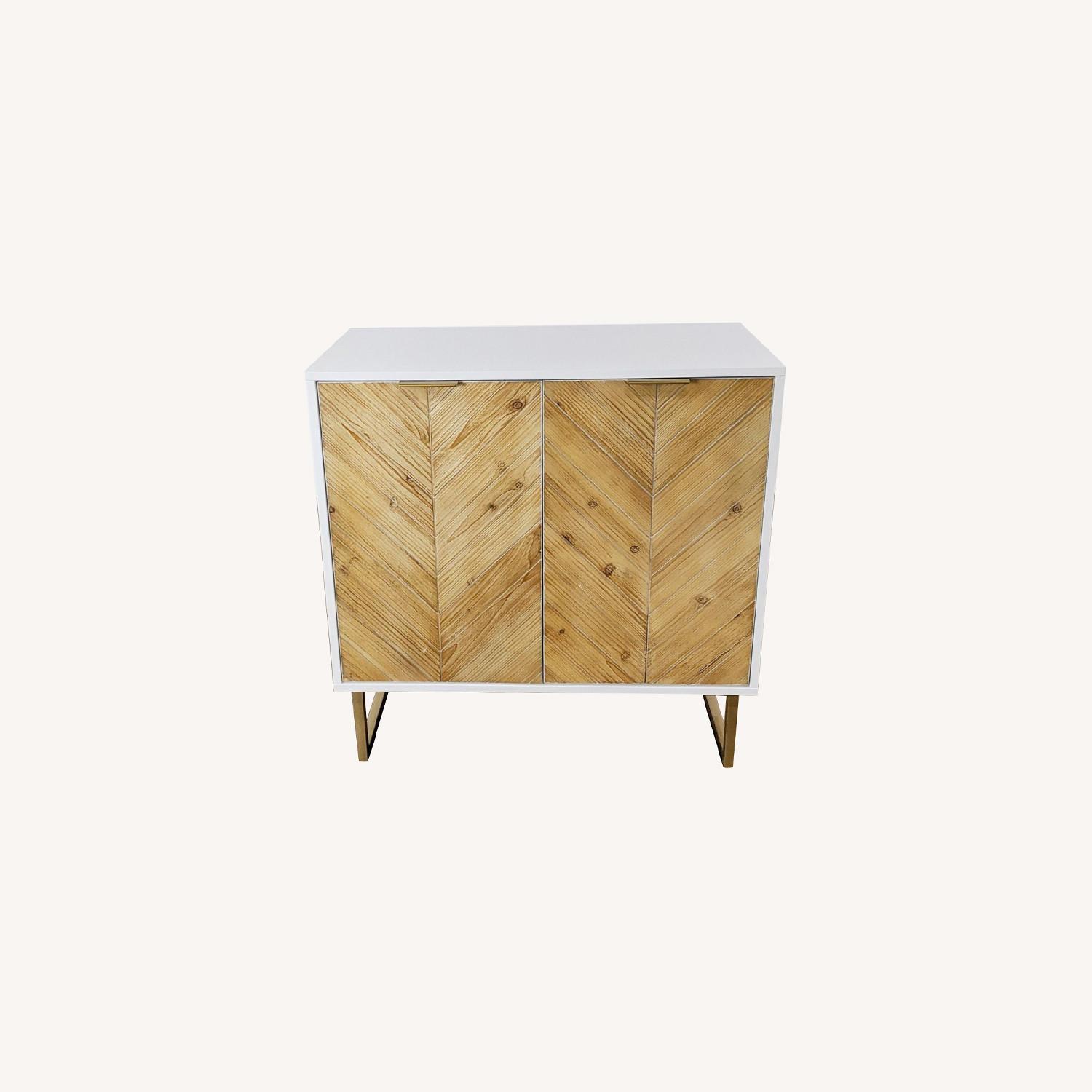 Seller's Notes:Free Standing Accent Cabinet with Doors in a Rustic Fir Wood Finish. Powder-coated Metal Base. Brand: Nathan James. Dimensions: 31.5x16x32.