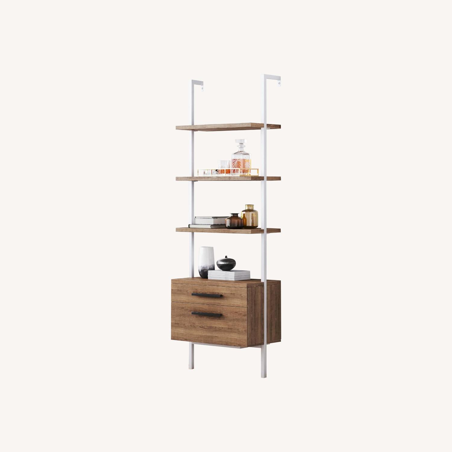 Seller's Notes:Wood + metal 4-shelf bookcase with 2 drawers. Minimalist open-design style with a strong frame, durable particle board shelves, and easy to glide drawers. Display decor, books, etc while also storing away items int he drawer. 55 lbs weight limit per shelf, 30 lbs weight limit per drawer.