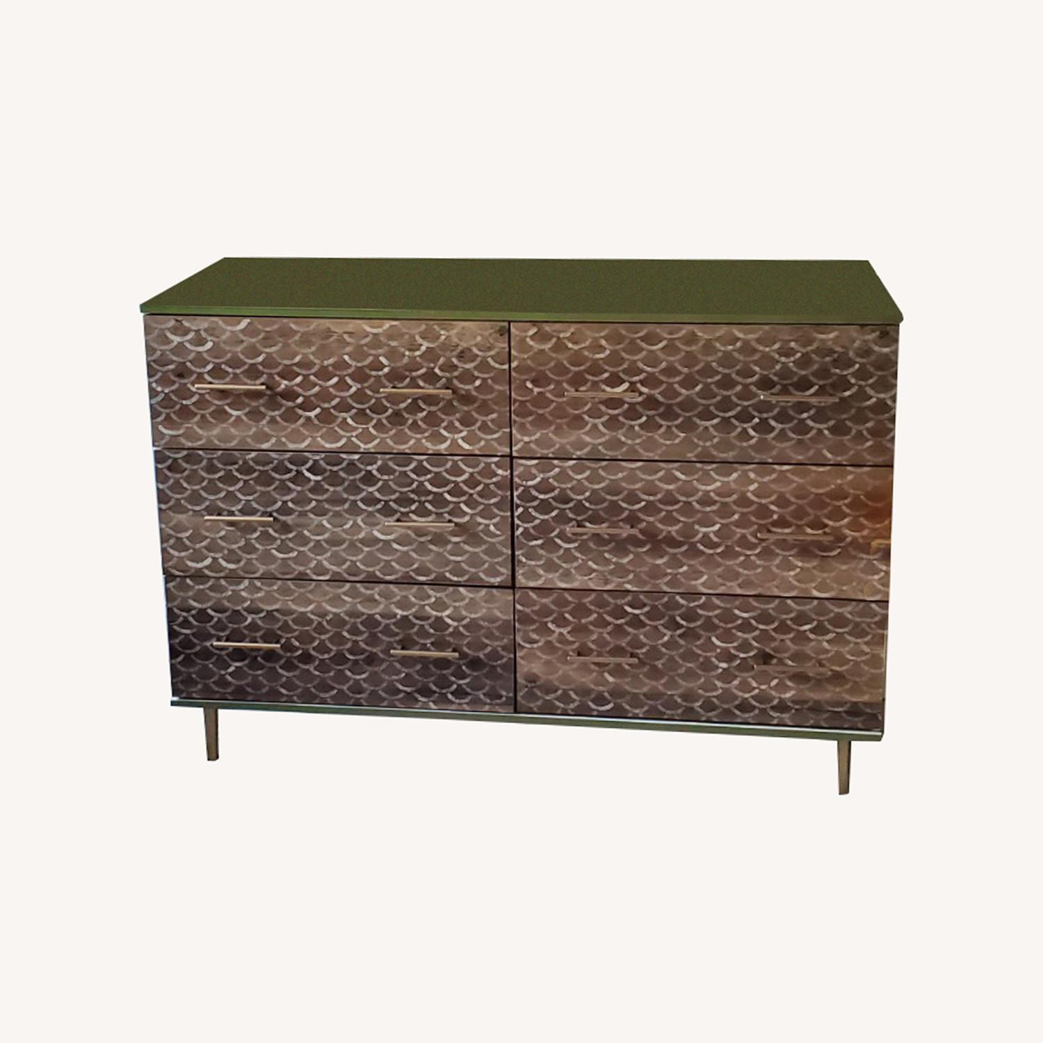 Seller's Notes:This formerly plain 6-drawer dresser has been pampered and transformed into a natural beauty and a statement in elegance. Beauty meets form and function, the mountains and the waves collide. She's a lovely shade of green, her wood accented drawer fronts have been embellished with a soothing wave pattern. To round things off are antique gold drawer pulls and leg. She was born to shine. Although she looks like a mermaid out of water, treat her well and avoid water damage to her delicate frame.