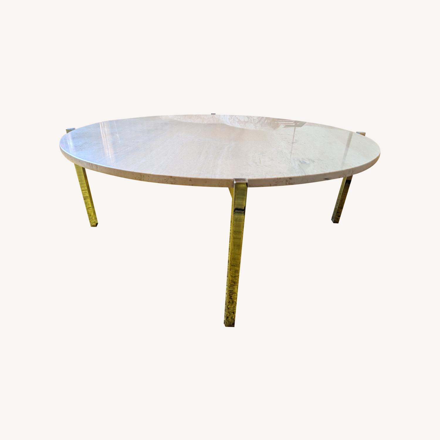 Seller's Notes:Round Marble-Top Coffee Table – 40” Diameter Elevate your living space with this sleek and timeless round coffee table featuring a smooth, natural marble top and polished metal legs. Dimensions: 40” diameter × 16” height Top: Solid natural marble with beautiful veining for a sophisticated look Base: Sturdy polished metal legs with a modern profile Style: A perfect blend of mid-century elegance and contemporary minimalism Ideal for anchoring a seating area, this coffee table adds texture, durability, and luxury to any living room.