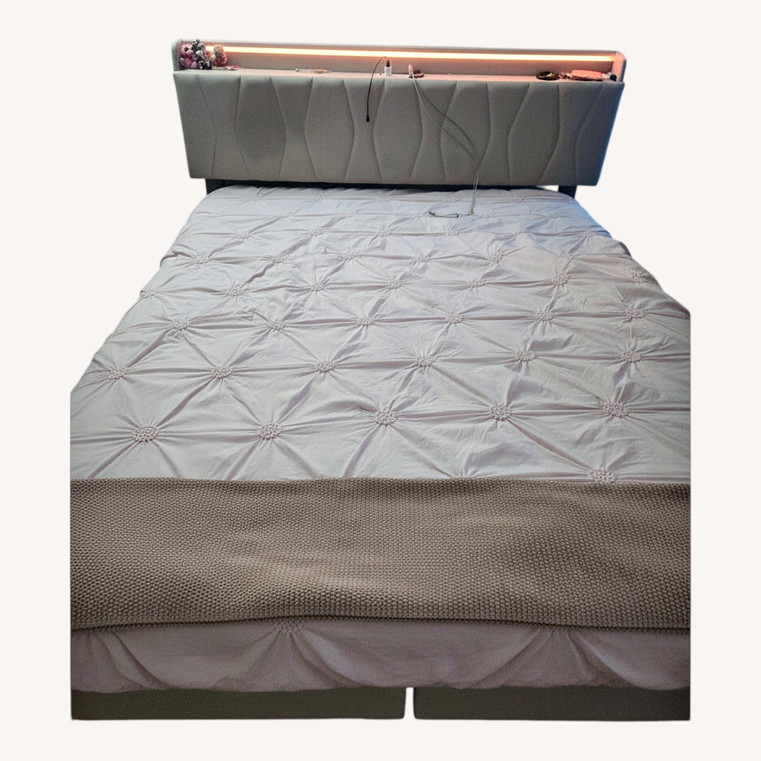Seller's Notes:This queen size box bed features a stylish upholstered headboard with built-in LED lighting and USB ports and storage. It offers ample under-bed storage with a hydraulic lift mechanism. Very Easy to detach and attach and has manual to fix it. Take Mattress for free , used only for 8 month. Very good condition.