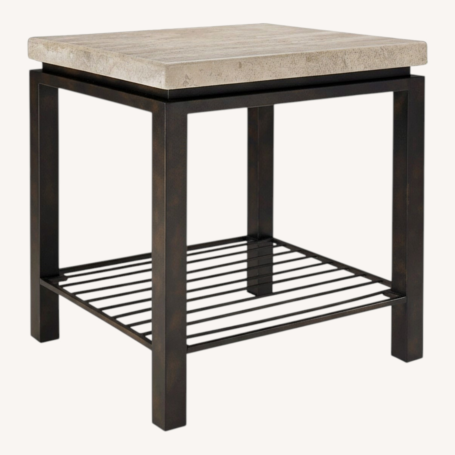 Accent your home or patio with the strong, sturdy look of the Tempo end table. Topped with a thick travertine stone slab, this table features a dappled bronze metal base in a dark satin finish.