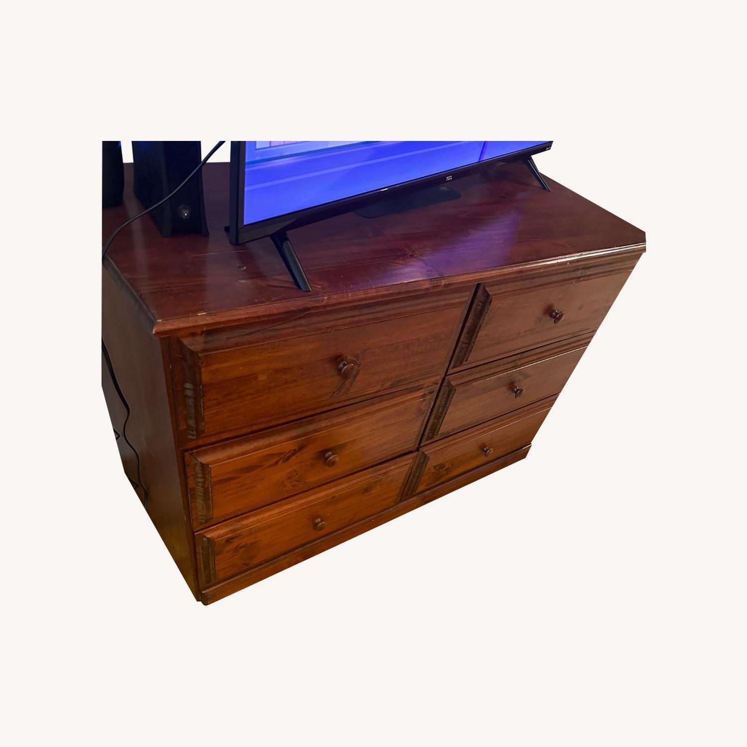Seller's Notes:Only a few years old and in very good condition. The piece has minor wear and tear from moving but otherwise the drawers are functional and fit a ton of stuff. It's a chestnut wood (not artificial) and very sturdy.