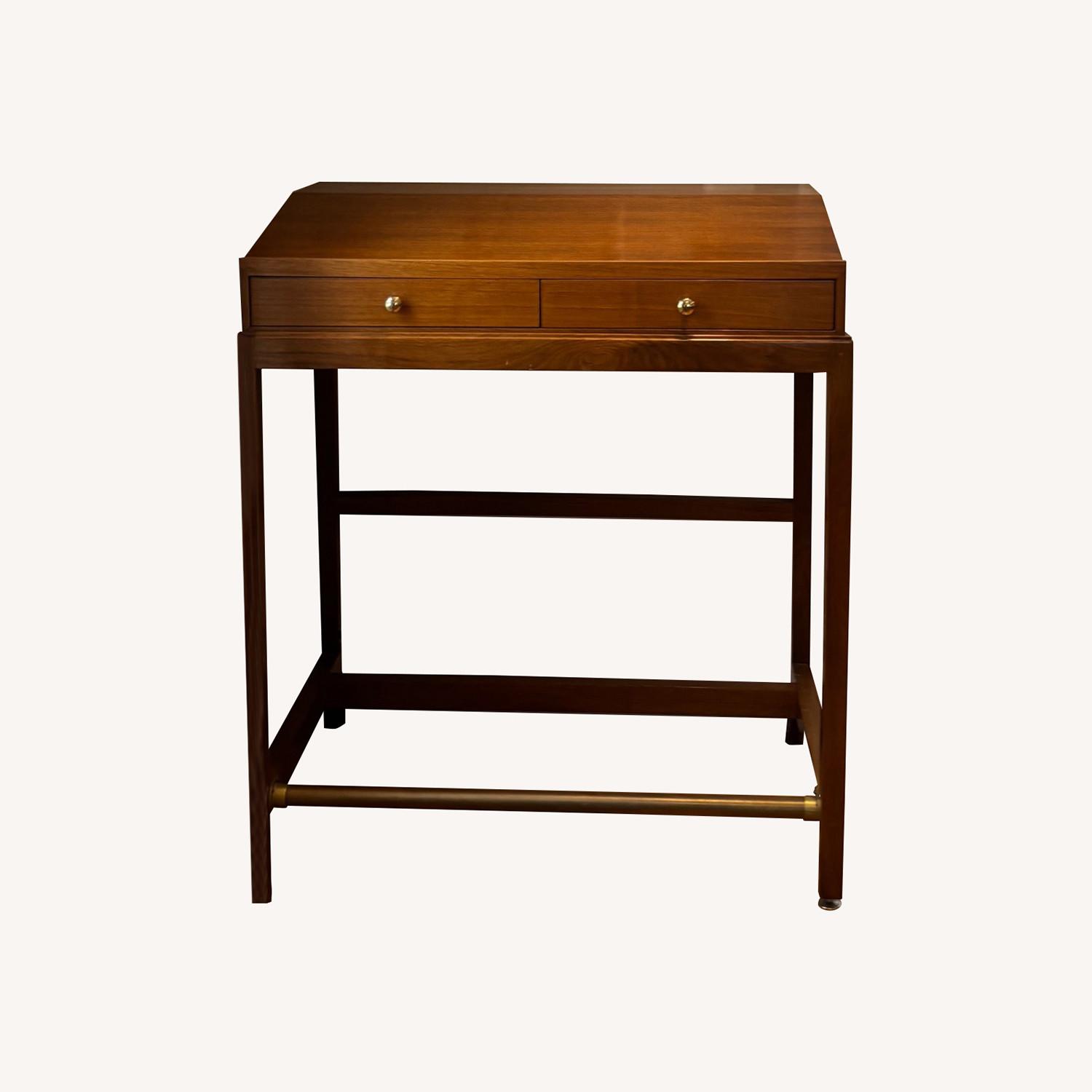 Seller's Notes:This beautiful standup Captains desk with brass rail has had one owner. Its natural wood is in excellent condition. With two well built drawers, it’s easy to stowaway useful items. Truly a beautiful piece.