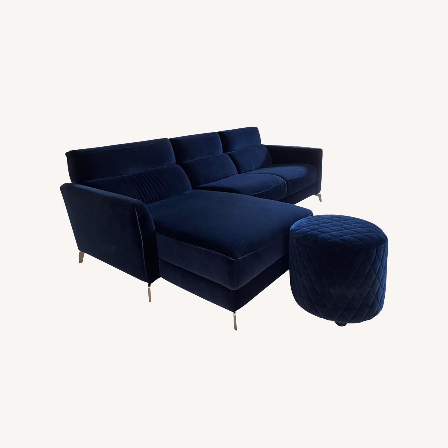 Seller's Notes:Custom Italian couch built by Natuzzi in navy velvet with navy leather trim accent. This couch was custom ordered, built and shipped from Italy. It is too small for our new living room so we are looking to sell it. We are the only owners and have had it for under one year. We also have a matching custom footstool that will be included ($700). We paid over $6,500 for the couch and footstool. This is an excellent deal considering the couch is available immediately and in mint condition. https://www.natuzzi.com/us/en/shop/natuzzi-italia/na-sofas-sectionals-sofa/stan-sectional-sofa-with-chaise-longue-fabric-light-green-3035xc0121001 115" x 34" x 63"