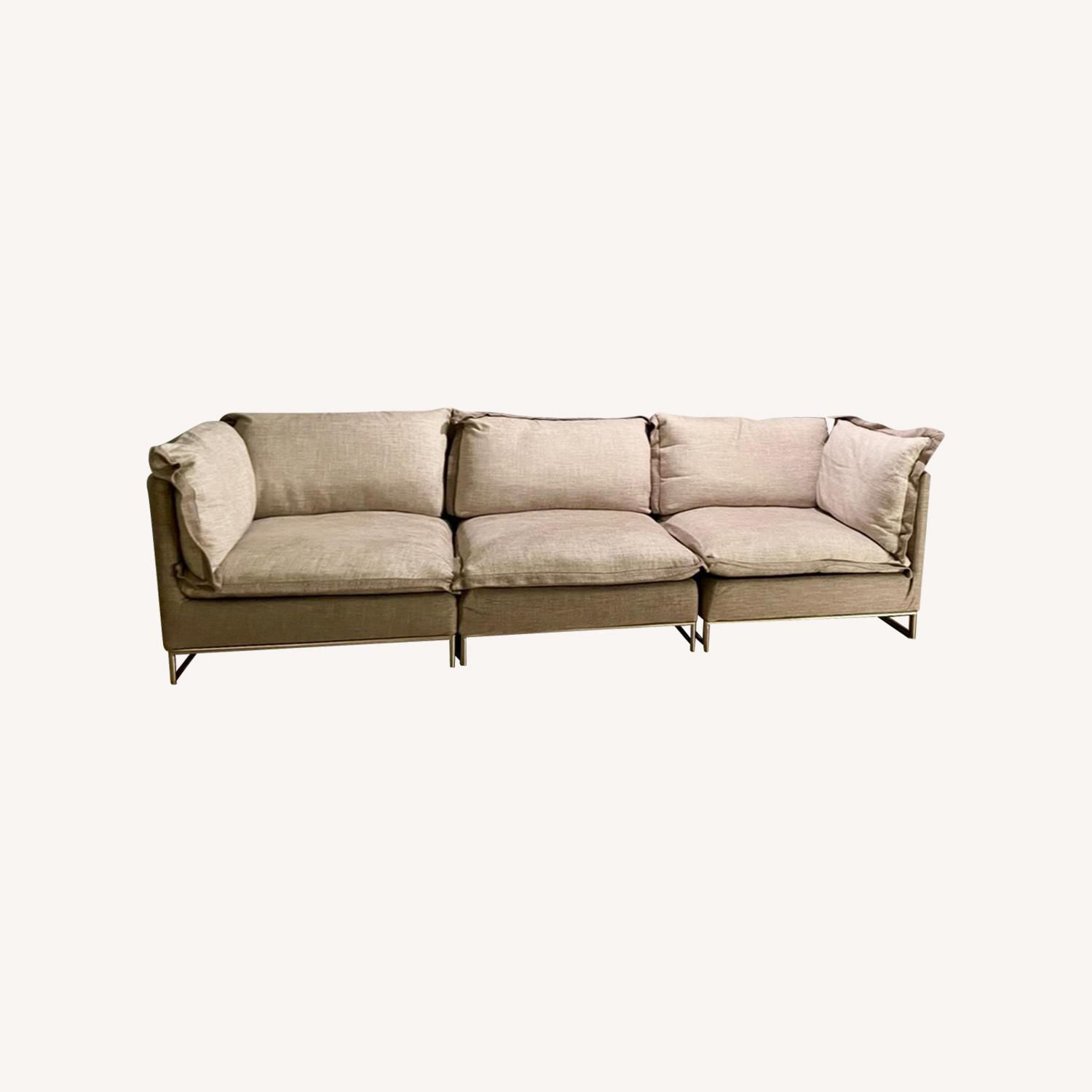 Seller's Notes:Elegant modern Italian sofa by Natuzzi Italia, model R638 (Morandi), featuring a polished metal sled base and plush deep cushions upholstered in a soft taupe viscose/cotton/linen blend. Exceptional comfort and craftsmanship. Model Identification • Model Code: R638-001 • Article (Fabric): Morandi 85004202 • Composition: 59% Viscose, 33% Cotton, 8% Linen • Cleaning Code: C (Dry Clean Only) • Made by: Natuzzi S.p.A. – Made in Italy • Dimensions: 106″ W × 36″ D × 31″ H (seat height: 10.5” base, with cushion 14.5”) • Condition: Excellent – lightly used, no stains or tears, smoke- and pet-free home • Fabric: Morandi 85004202 (59 % viscose / 33 % cotton / 8 % linen) • Cleaning Code: C – Dry Clean Only • Retail: ≈ $6,000 new • Asking: $1,650