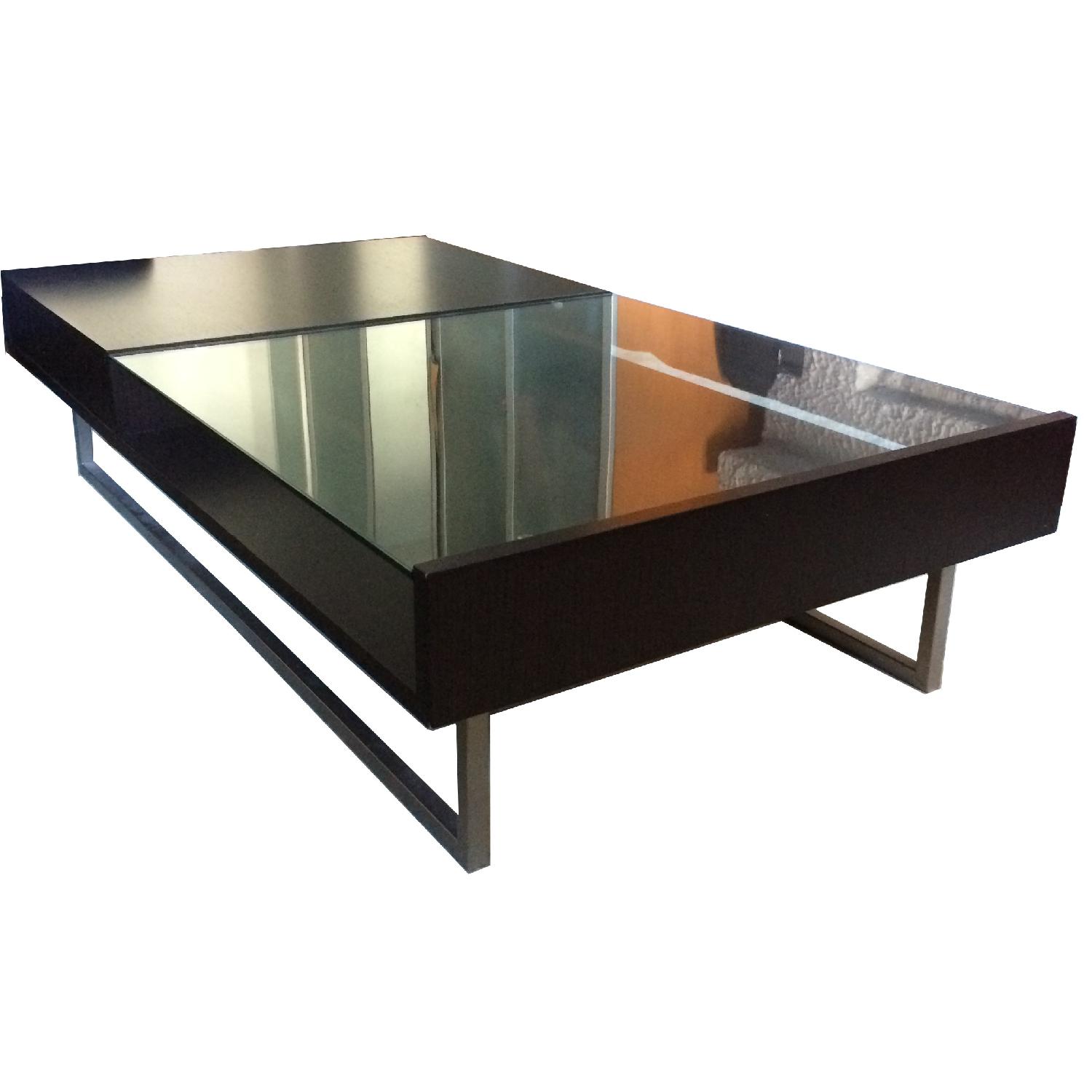 Seller's Notes:Beautiful clean lined coffee table with hidden drawer! Dark wood & glass with steel legs. Glass side has an open section below to display books or other objects. A few minor chips in the wood and some barely visible scratches on glass, overall a really nice, well taken care of piece. Purchased from Natuzzi in Soho in NYC Any questions please ask!