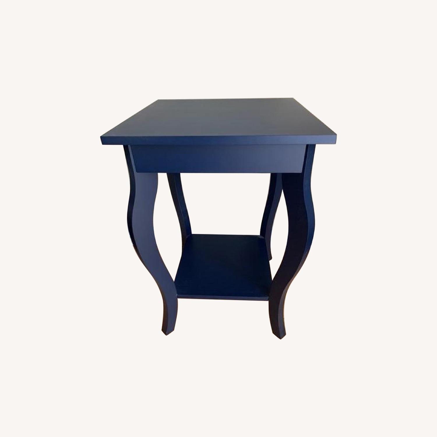 Seller's Notes:Navy blue end table with shelf great for living room and bedroom. Plenty of display and storage space between the top surface and bottom shelf. Excellent condition.