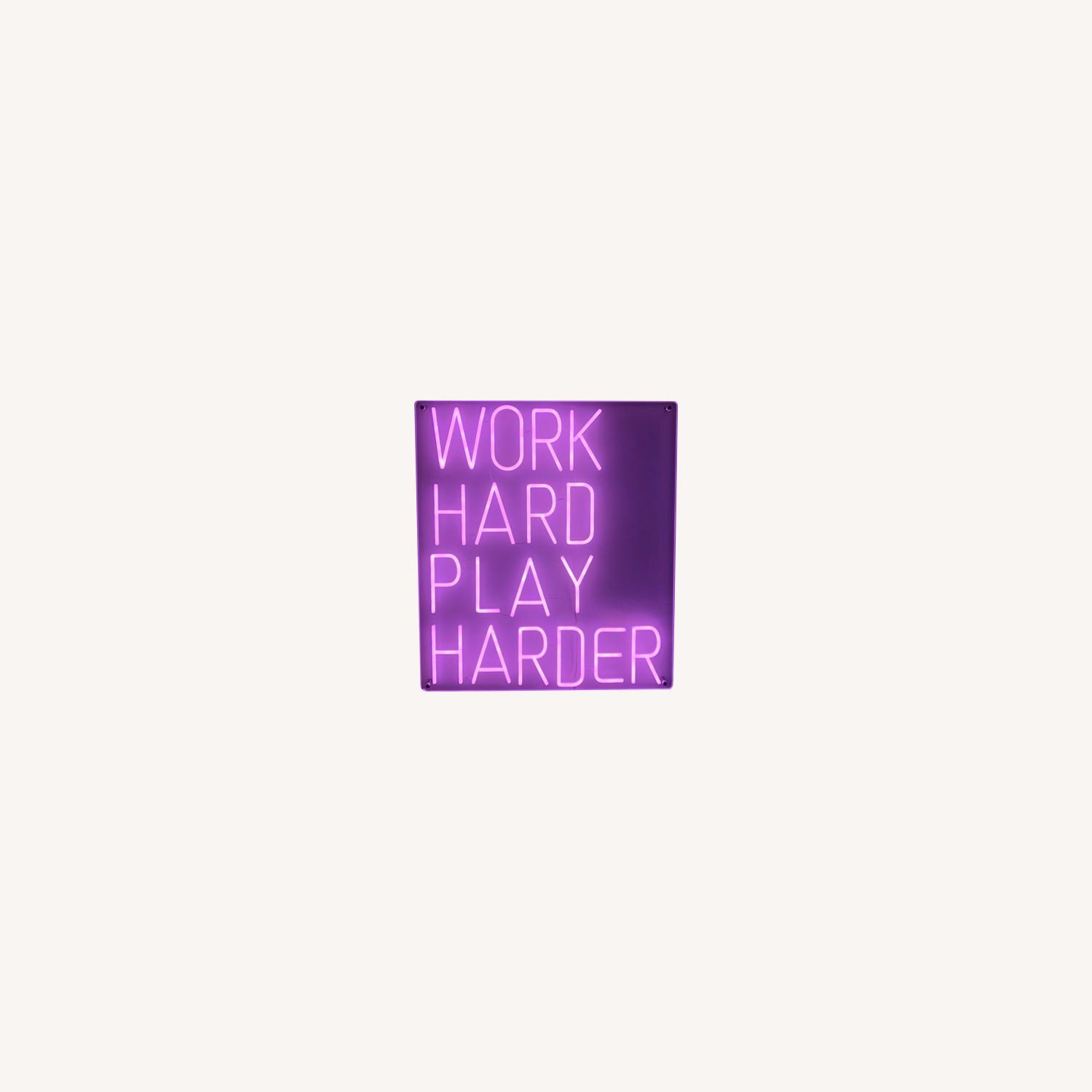 Seller's Notes:Awesome “WORK HARD PLAY HARDER” neon sign, perfect for mood lighting and parties! Has a small crack above the A, hardly noticeable. Selling sign only—doesn’t come with hanging hardware (just screws) or power adapter (easy to buy online separately for any plug type).